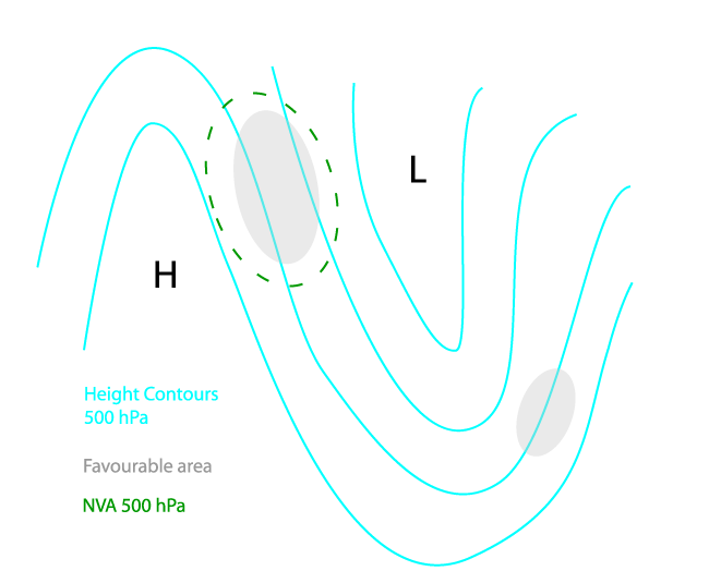 In most cases, because of the influence of a building or approaching upper ridge, NVA is found.