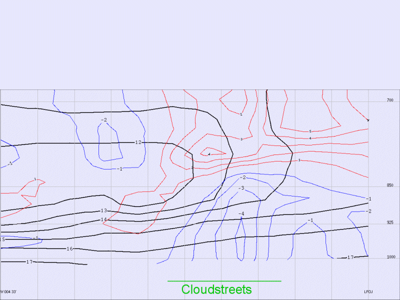 The dynamics of Cloud Streets generally differ totally from the other conceptual models described in this manual. Most of the essential processes take place in the lowest 1 - 2 kilometres, the processes themselves are in the range of micro/meso scale rather than baroclinic at the synoptic scale. However cross sections can help to detect the synoptic environment in which Cloud Streets can develop.