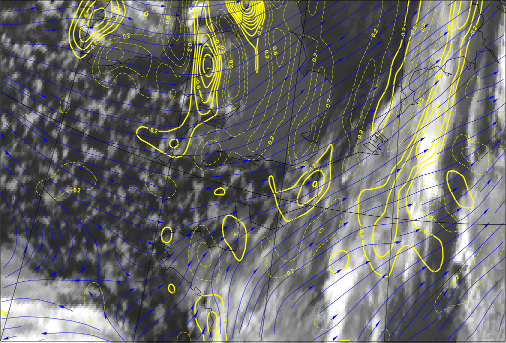 13 January 2007/12.00 UTC - Meteosat 9 IR10.8 image; yellow: omega 925 hPa, blue arrows: 10-metre-wind streamlines