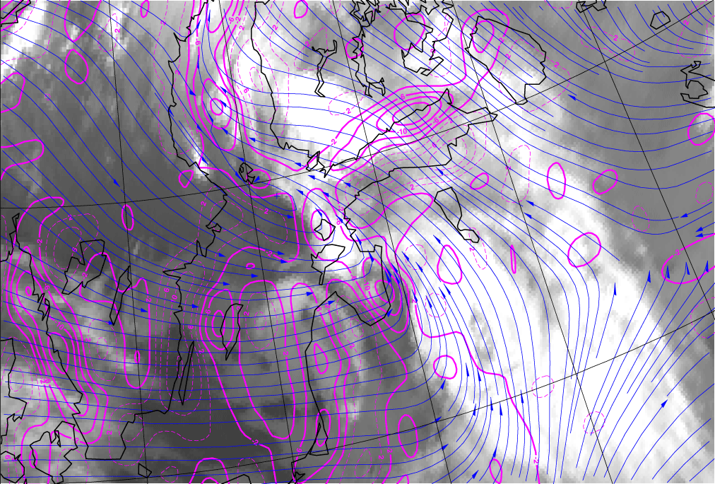 18 November 2006/18.00 UTC - Meteosat 9 IR10.8 image; magenta: divergence 1000 hPa, blue arrows: 10-metre-wind streamlines