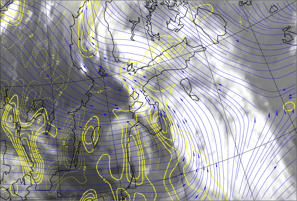 The example shows that even when the frontal cloudiness hides the Coastal Convergence, it still indirectly can give valuable information for diagnosis: the orientation of the frontal cloud in respect to the coastline may assist in evaluating the likelihood of Coastal Convergence - even without the numerical wind fields. If the frontal cloudiness remains stationary for a period of time, the probability of appreciable enhancement of coastal precipitation increases.