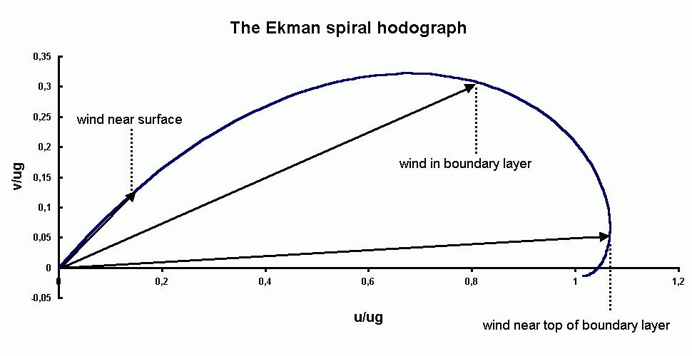 The image above shows the ideal hodograph representing the well-known Ekman spiral. The wind profile is generally unstable for a neutrally buoyant atmosphere. The secondary circulations which develop as a result of this instability tend to flatten the above-shown hodograph, that is, to decrease the ageostrophic component. However, a distinct ageostrophic component of the wind (v/ug) still remains in the boundary layer. The velocity of this ageostrophic component depends on the roughness of the underlying surface. Over land the roughness length z0 is in the order of few centimeters while for sea surface z0 is only a few millimeters. Due to this the wind backs more over land than over sea.