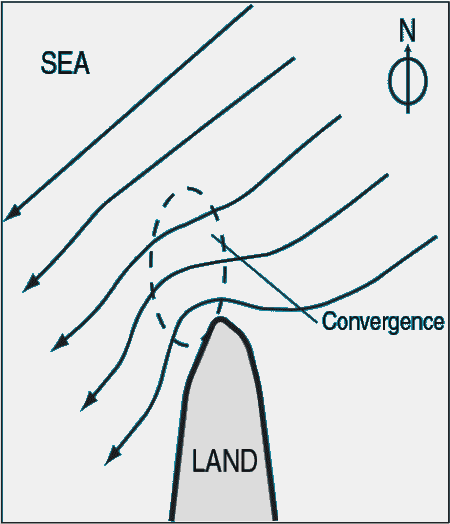 The differences in both the speed and direction of wind across the coast lead to small-scale convergent and divergent areas and associated vertical motions. The locations of convergence-divergence driven vertical motions naturally depend on the orientation of the coastline with respect to the flow. The basic types of frictional convergence can be described schematically as follows: