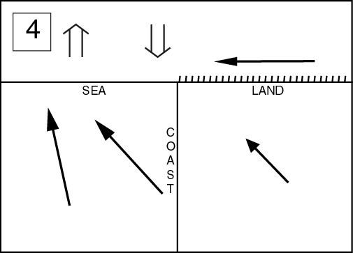 The flow configurations already described in diagrams 3-6 show the convergence-divergence patterns and the vertical motions when the airflow has a small angle with respect to the coastline. The most interesting type is case number 3, where onshore wind blowing from southwest has a major influence on ascending motion over land. This applies to a north-south -oriented coastline; more generally the type could be described as follows: