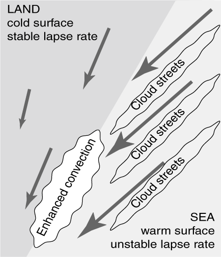 Respectively, an onshore flow on to cold land may bring along rapid deceleration and strong inland backing of winds. The deceleration is weaker and more gradual over warm land.