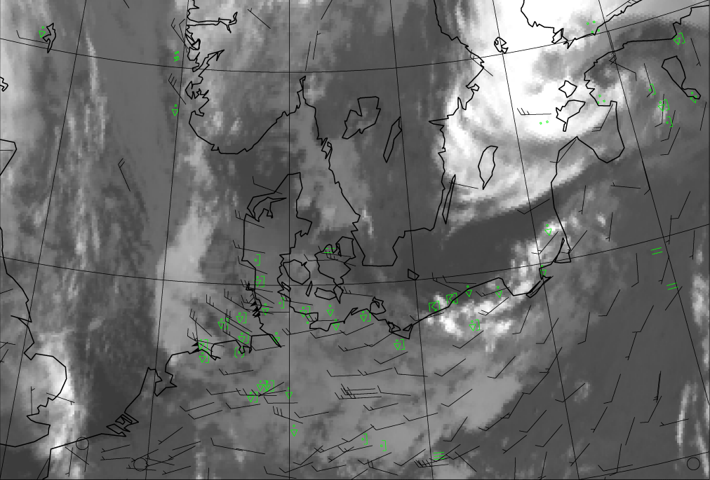 31 July 2007/00.00 UTC - Meteosat 9 IR 10.8 image; green: weather events