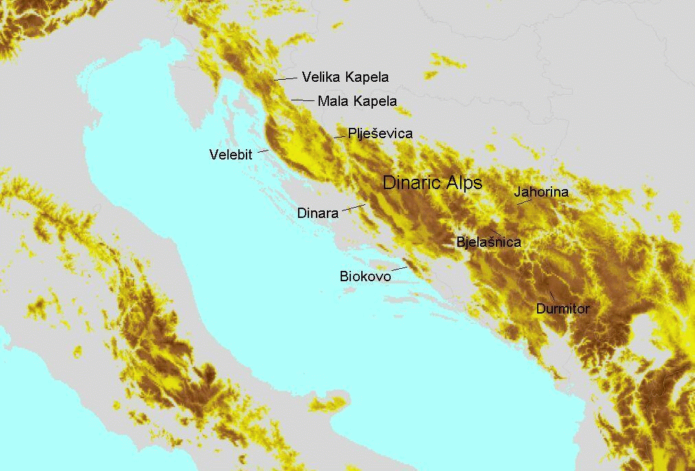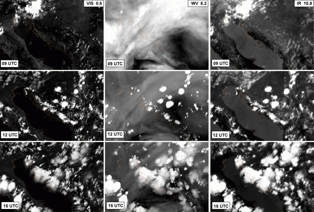 Lines of convective clouds often develop from the Northwest to the Southeast part of the Dinarides. The convective cells within the line are most pronounced over the highest mountain peaks, and more developed near to the Adriatic coast. At 12.00 UTC the characteristic clouds are clearly visible over mountains Velebit, Dinara, Mala and Velika Kapela, Jahorina, Bjelašnica and Durmitor. In the afternoon clouds can merge into bigger systems and cirrus anvils form, whereas some of the cells are dissolved.