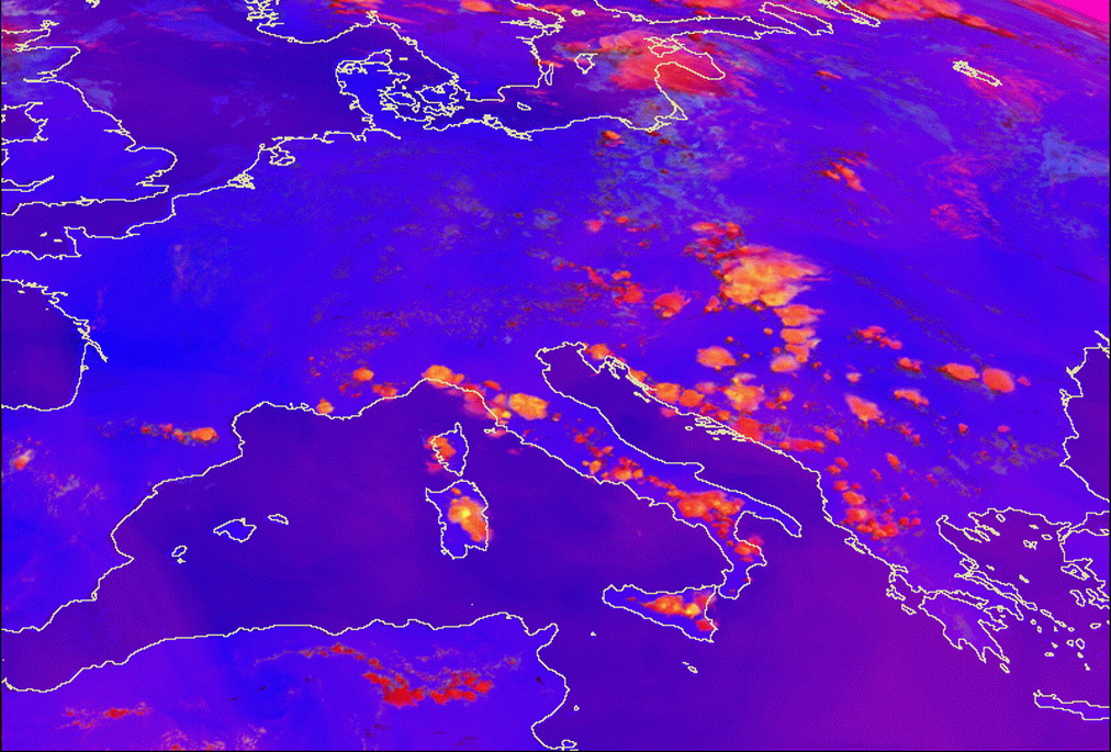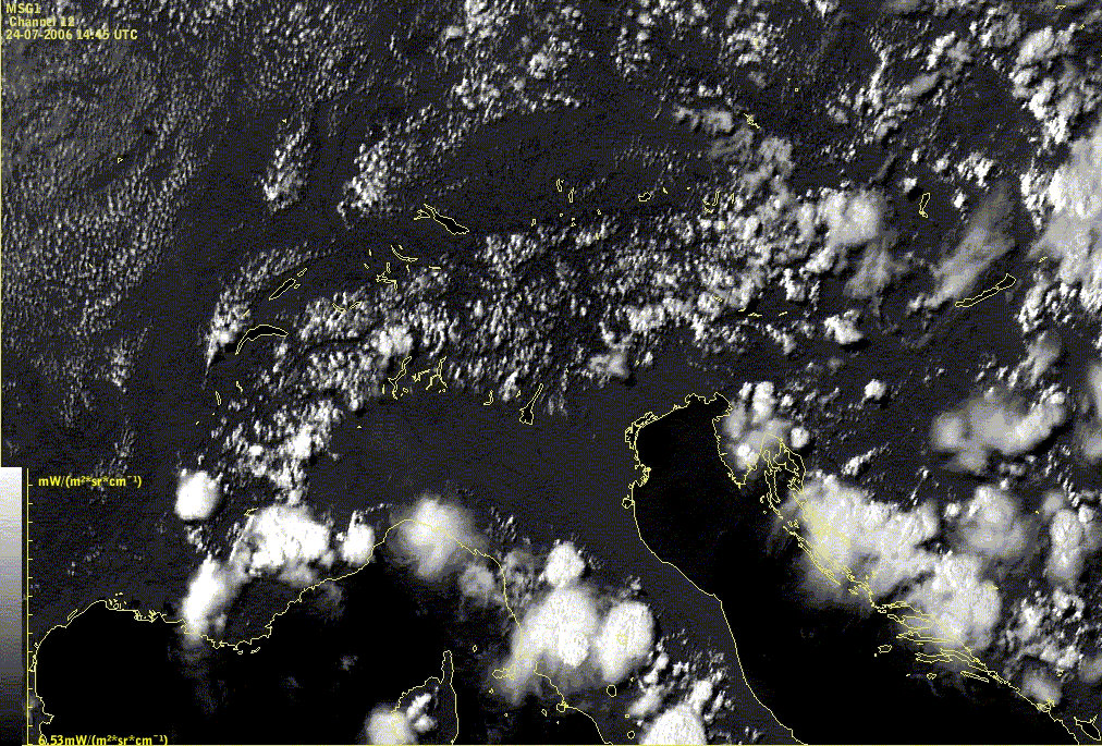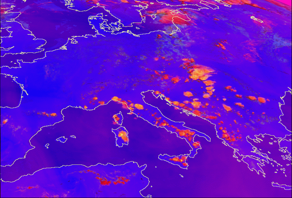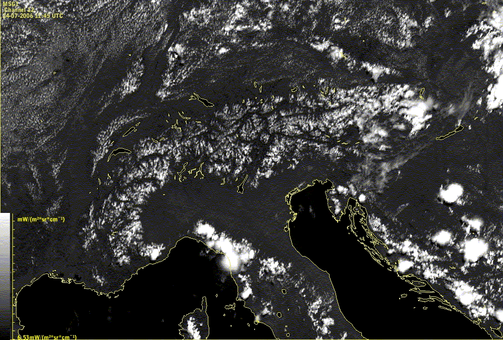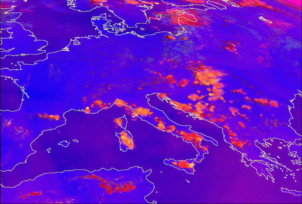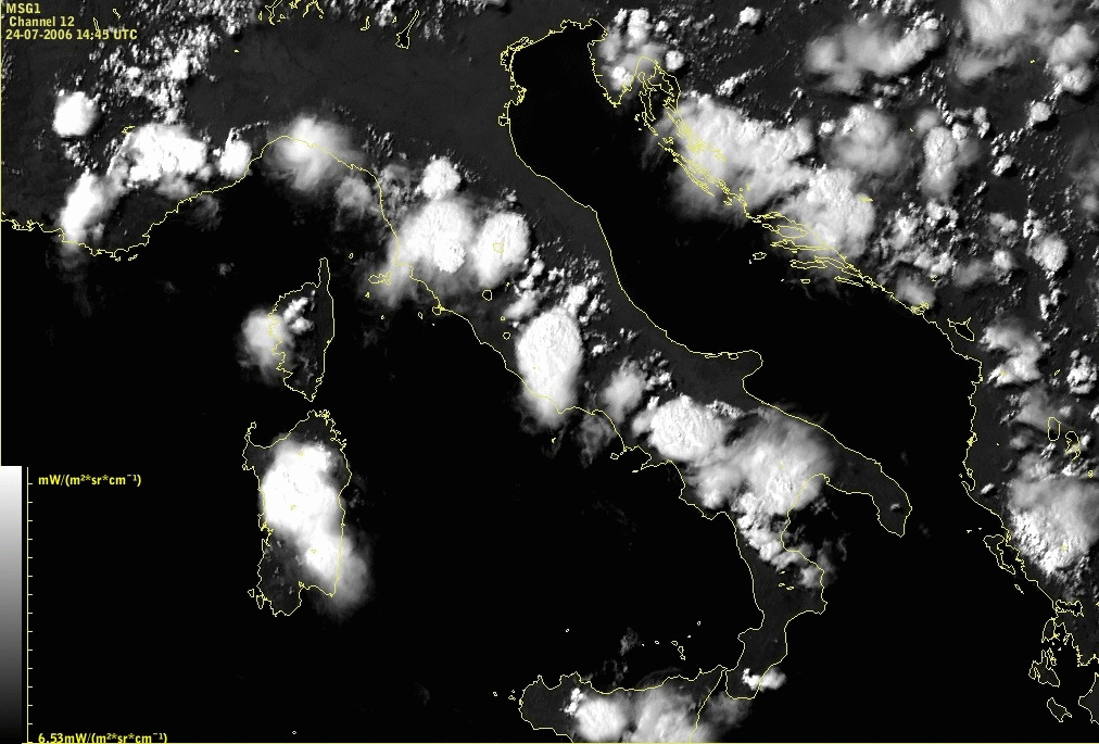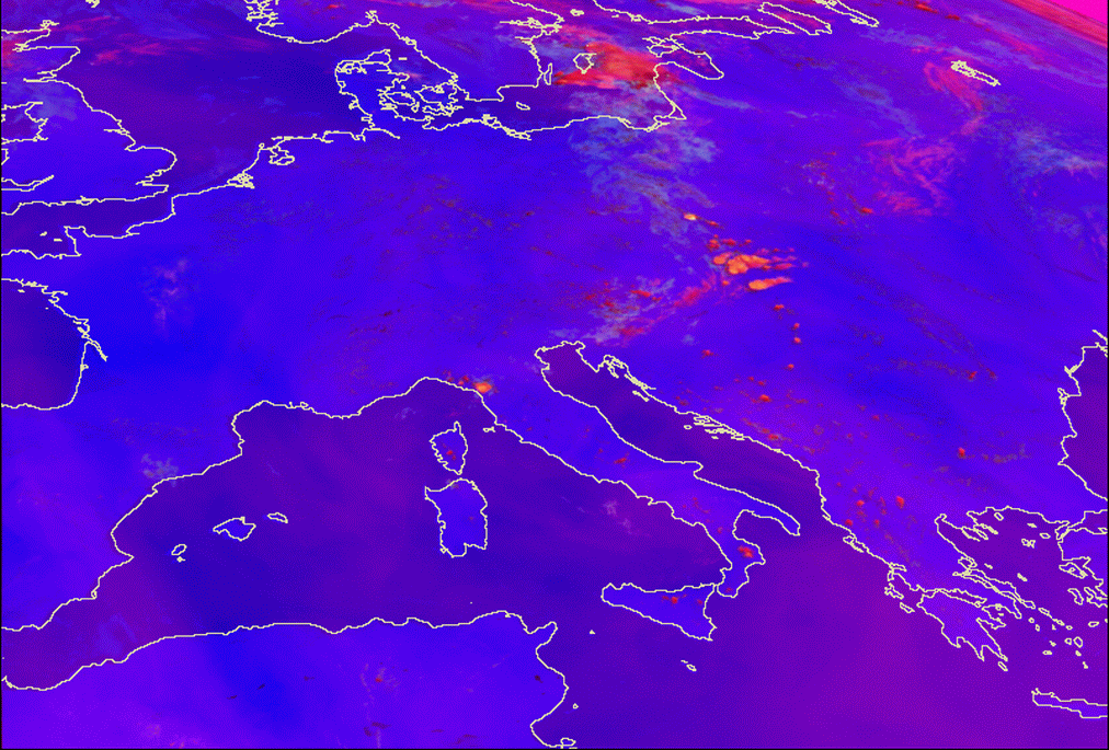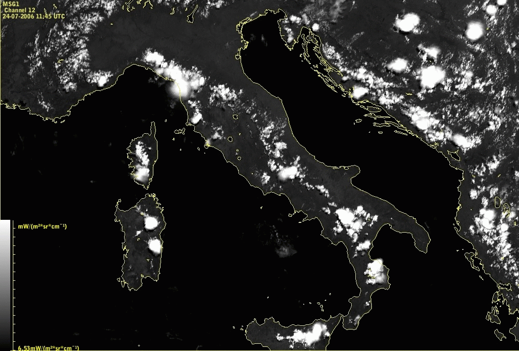Over the Apennines convective clouds can be seen all along the peninsula with the largest cells over the highest mountains. On Corsica and Sardinia clouds are also visible over the mountain peaks and on Sicily over Etna. The brightest clouds at 12.00 UTC are over Ligurian, Tuscanian-Emilian, Central and Lucarian Apennines.