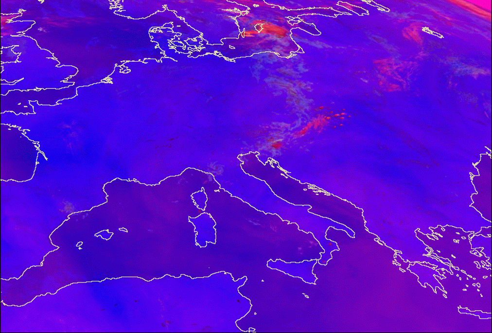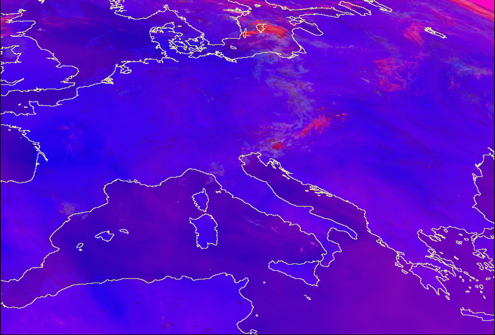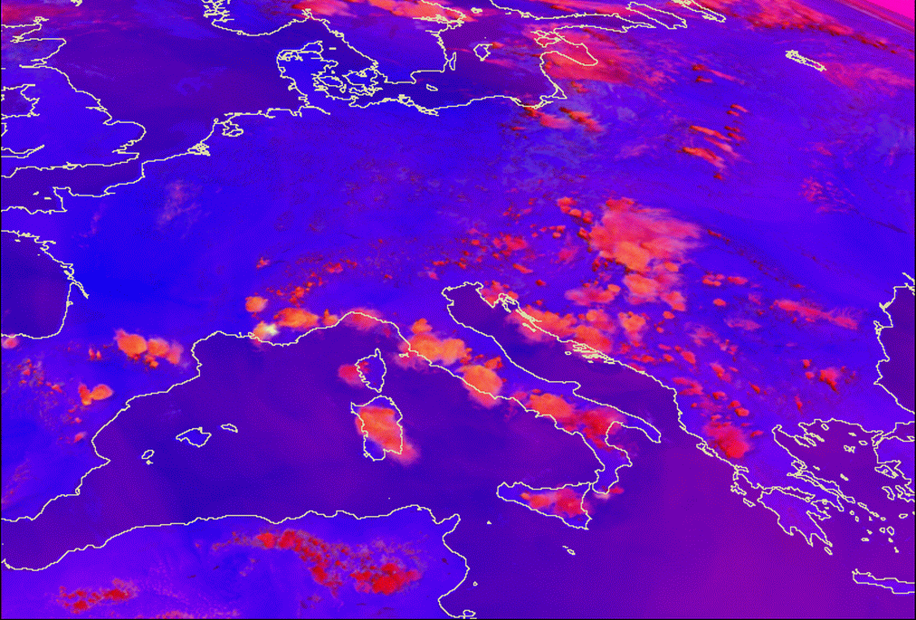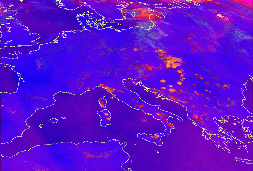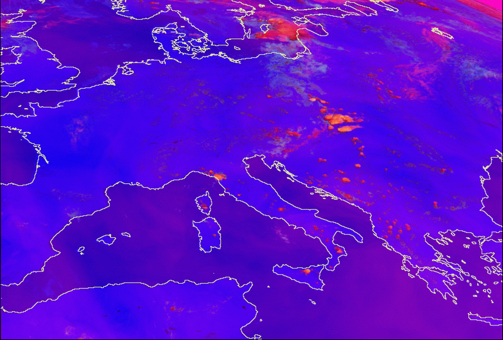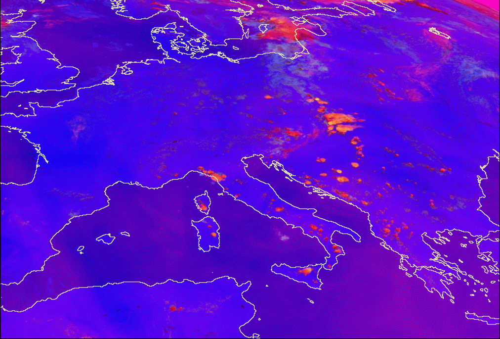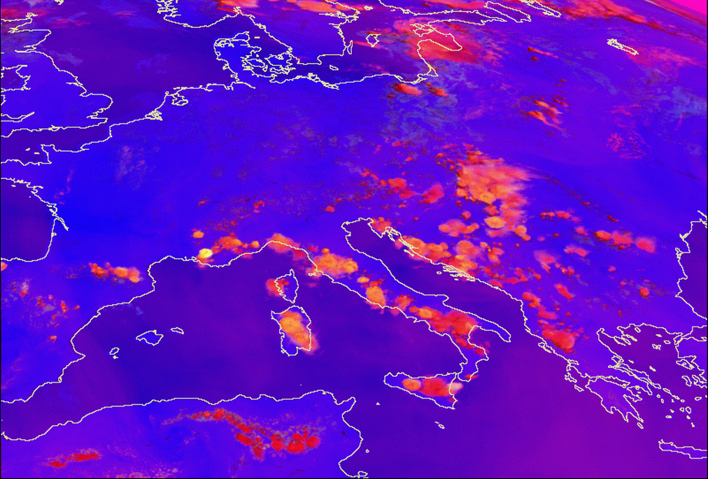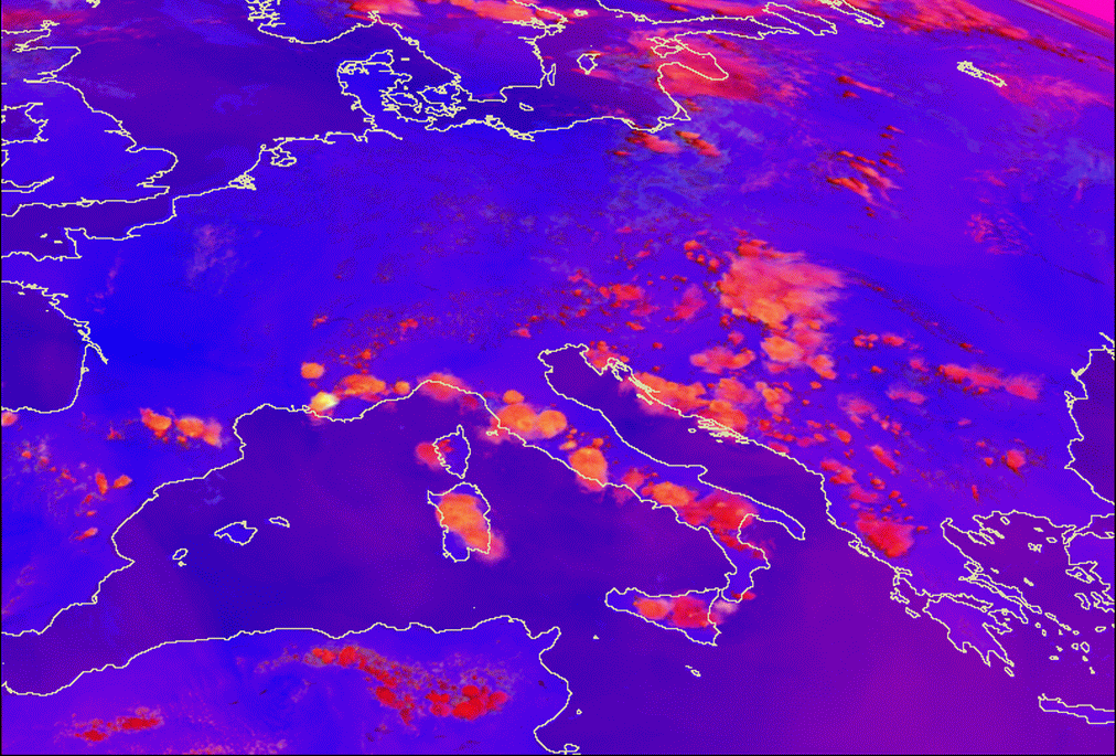 Over the Apennines convective clouds can be seen all along the peninsula with the largest cells over the highest mountains. On Corsica and Sardinia clouds are also visible over the mountain peaks and on Sicily over Etna. The brightest clouds at 12.00 UTC are over Ligurian, Tuscanian-Emilian, Central and Lucarian Apennines.