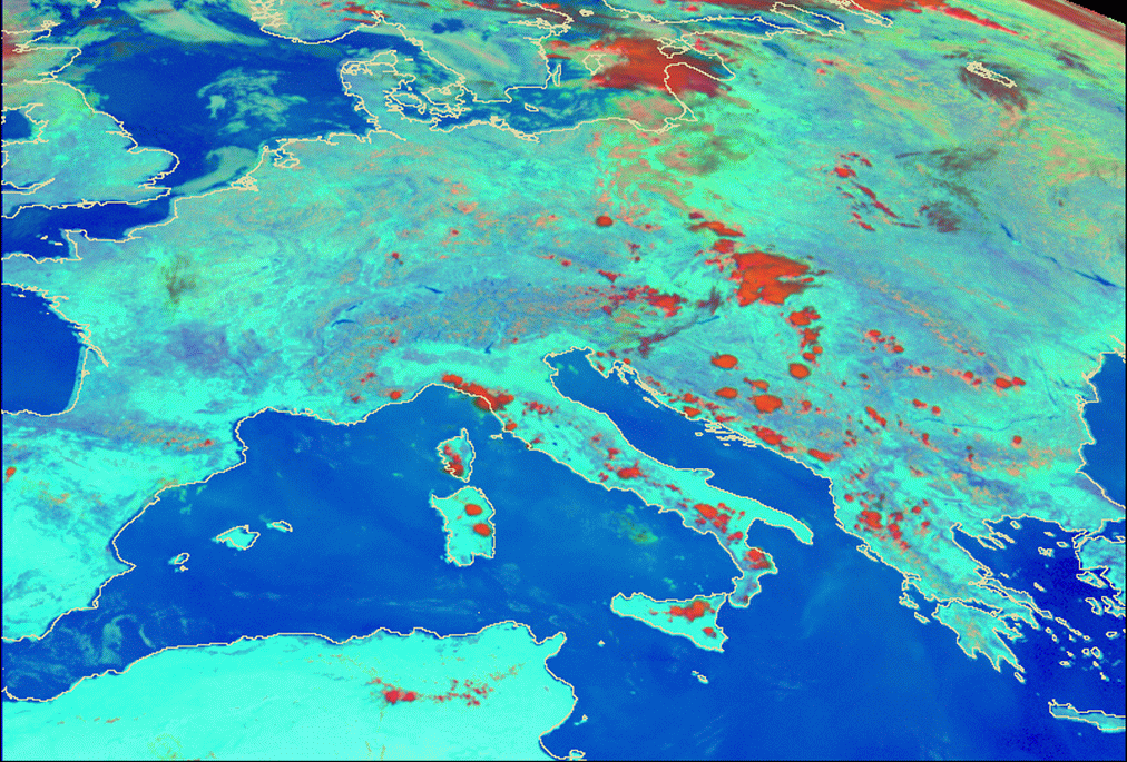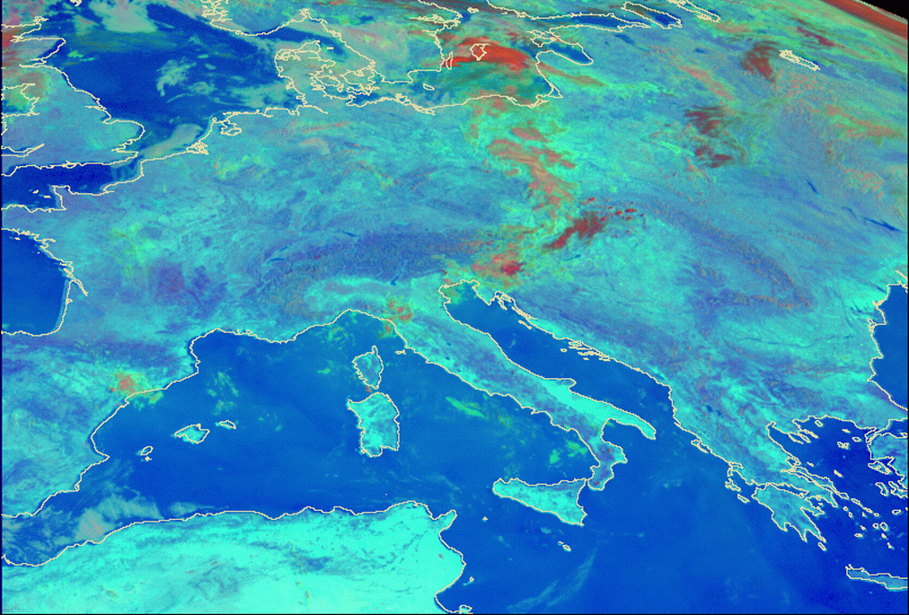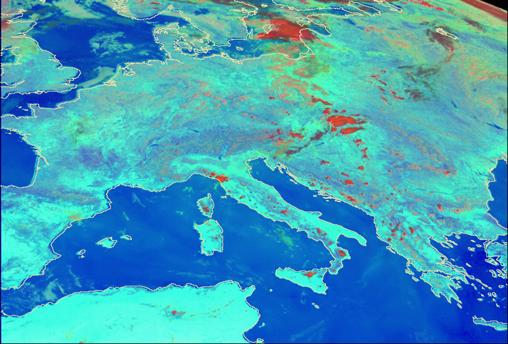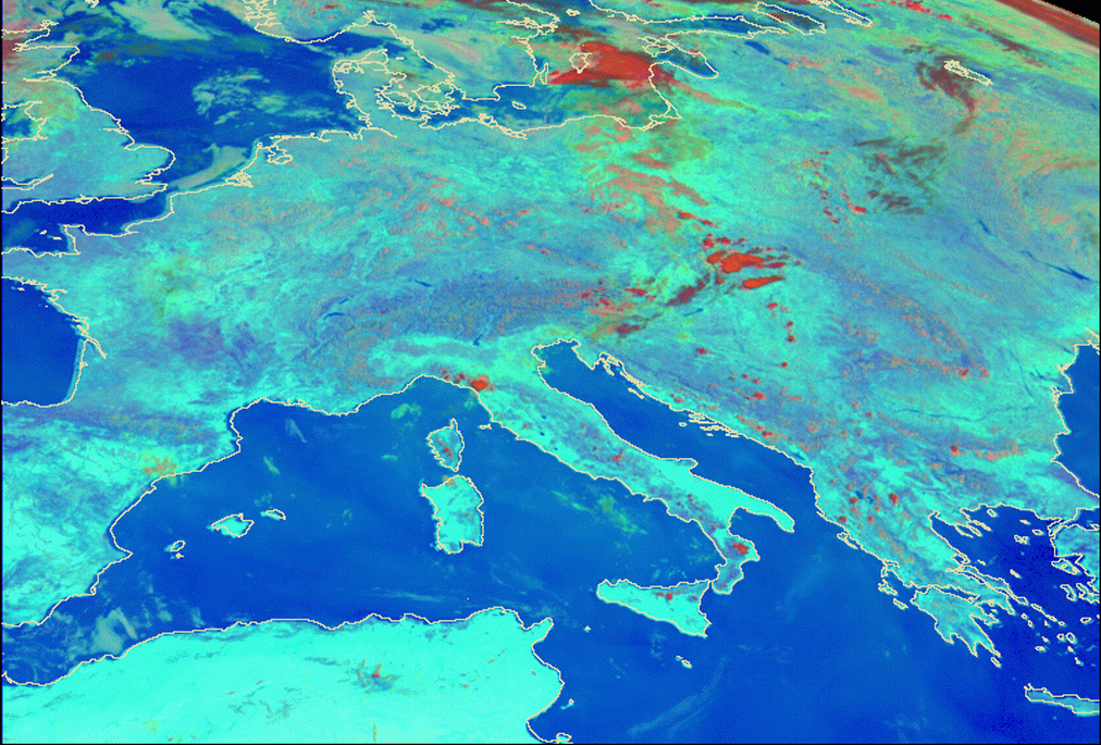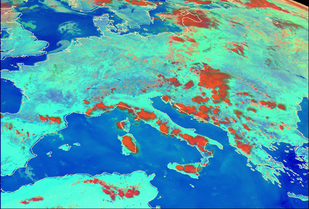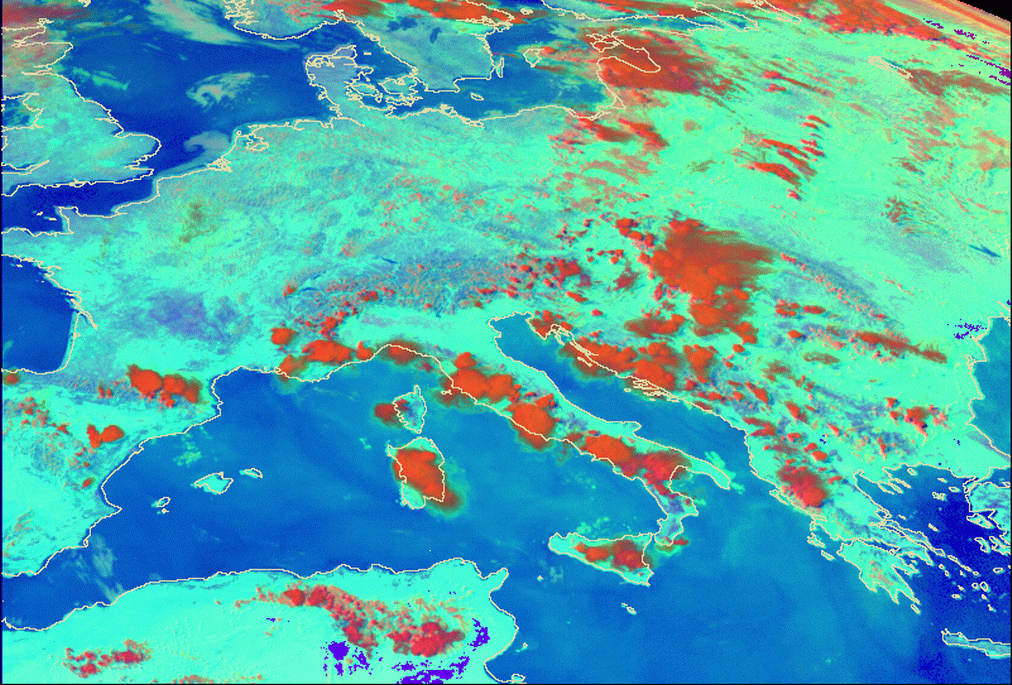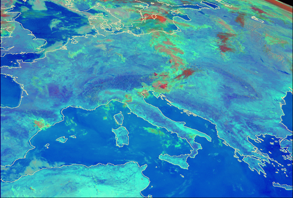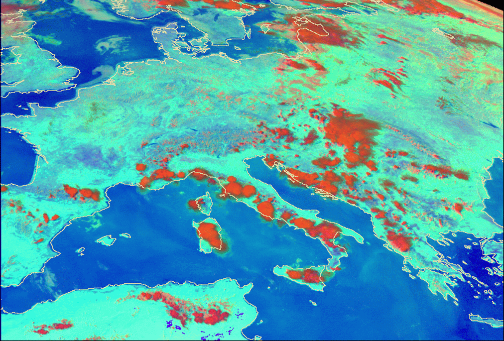 Over the Apennines convective clouds can be seen all along the peninsula with the largest cells over the highest mountains. On Corsica and Sardinia clouds are also visible over the mountain peaks and on Sicily over Etna. The brightest clouds at 12.00 UTC are over Ligurian, Tuscanian-Emilian, Central and Lucarian Apennines.