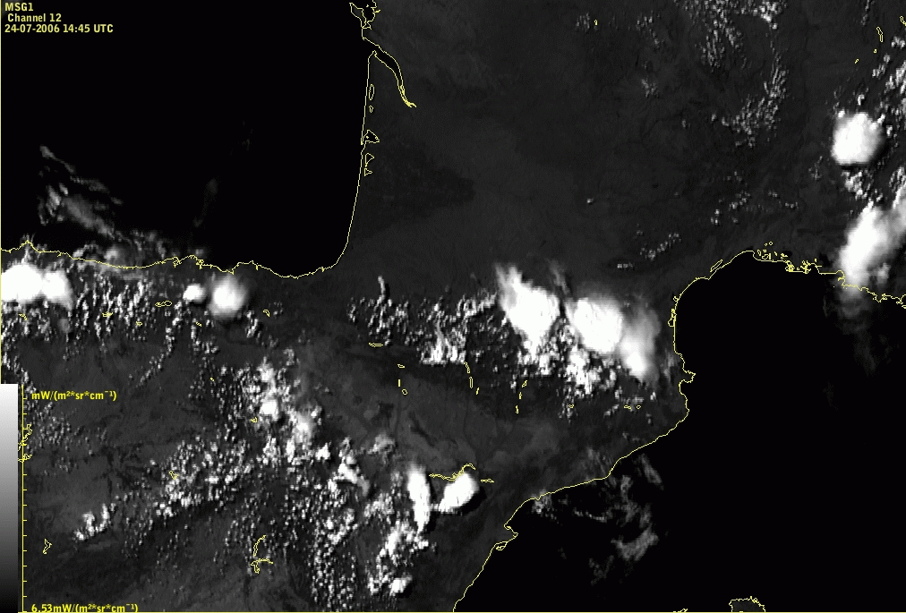 Lines of convective clouds due to convergence over the Pyrenees often develop from west to east with the largest cells developing over the highest mountain peaks. More intensive development can be seen in the Eastern part of the Pyrenees from Moncalms to Pic of Carlitte in the afternoon. In HRVIS images in the Eastern part of Pyrenees the clouds are brighter than in the Western part.