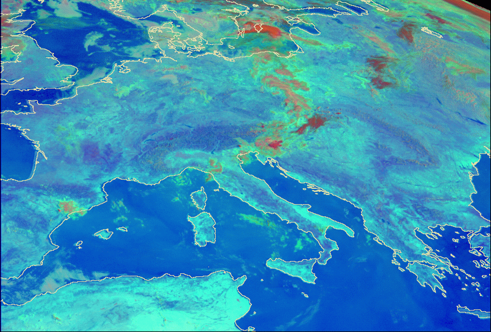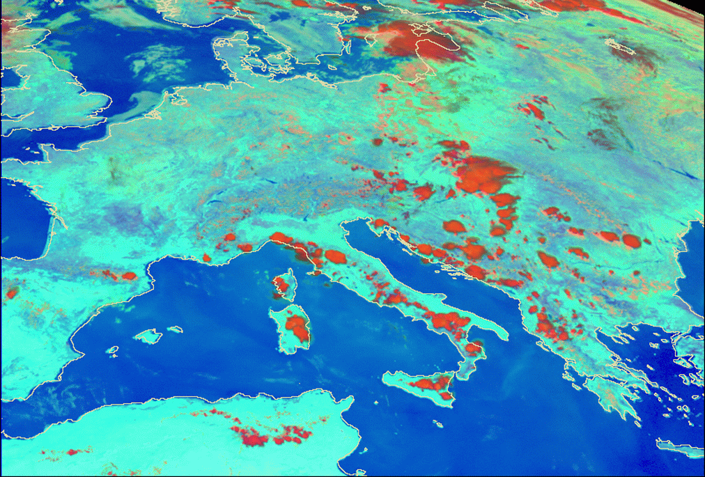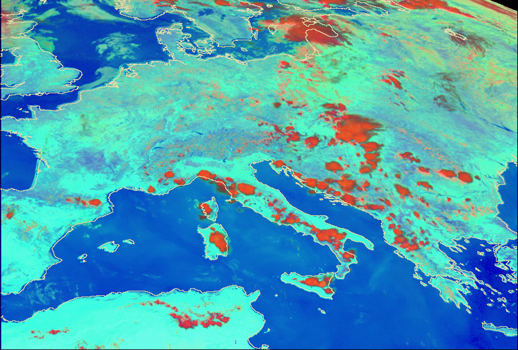 24 July 2007/08.00 UTC - Meteosat 8 Day Microphysical Summer RGB image (0.8; A3.9; 10.8); 08.00 - 15.30 UTC half-hourly image loop
