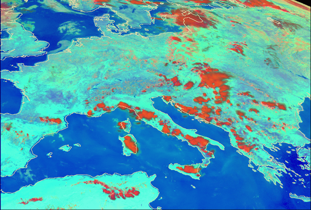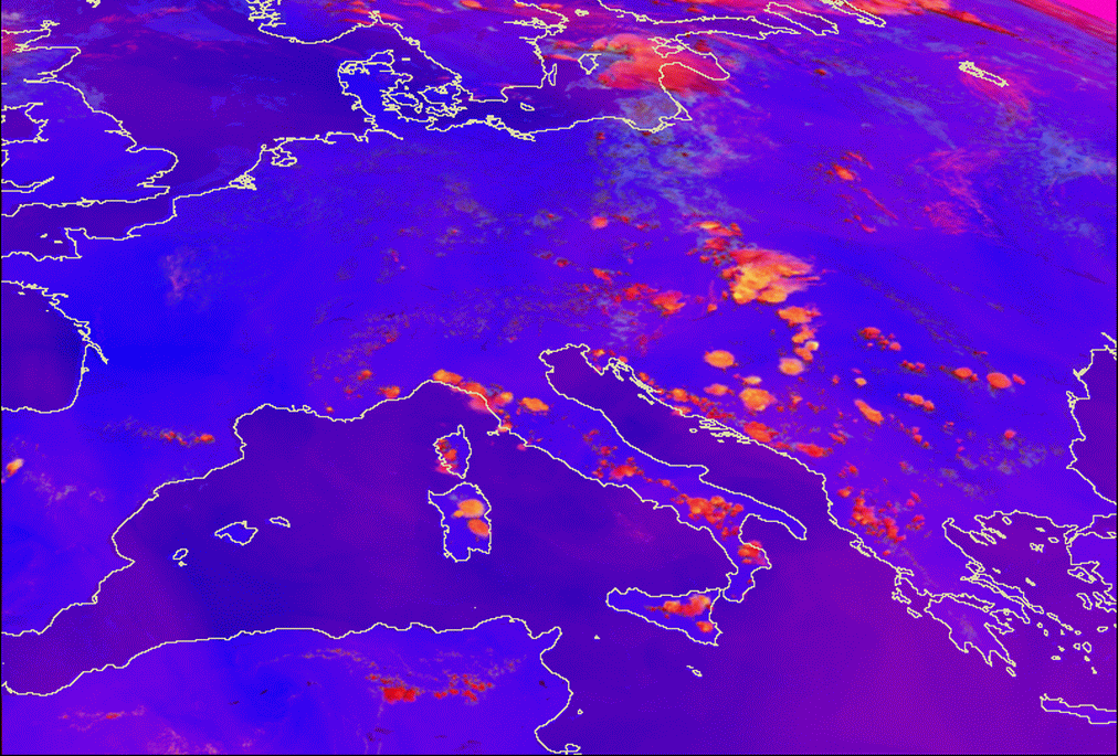Lines of convective clouds over the Apennines show typical development including convective clouds over islands Sardinia, Corsica and Sicily.