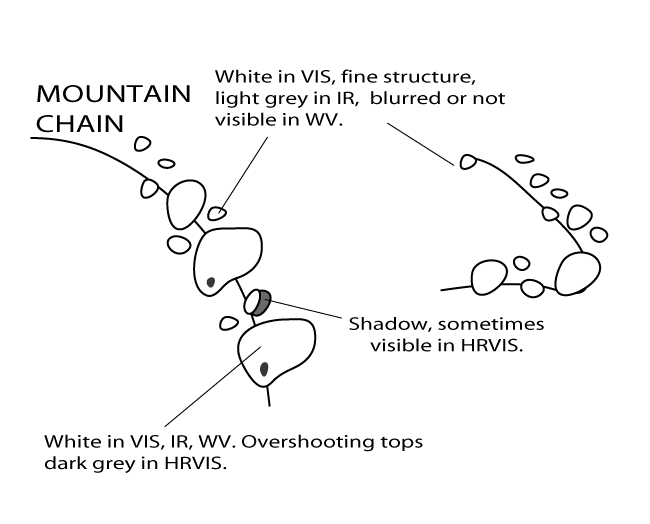Compared to the appearance in the Meteosat 7 images, in which they were seen as bright lines along the mountain chains, higher spatial resolution of Meteosat Second Generation images enables the distinction of very small convective cells within the Convergence Line.