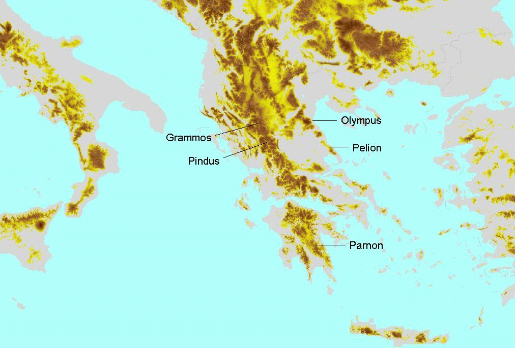 Lines of convective clouds can often be found over the Peloponnesian (Parnon), Pindus and Grammos mountains. Sometimes there are smaller lines in the East over neighbouring mountain chains.