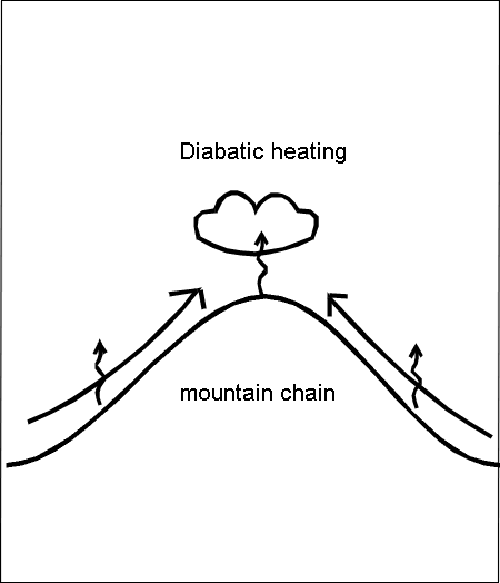 wind field results in convergence directly over the mountain chains or sometimes slightly shifted to the leeward side. Upward motions