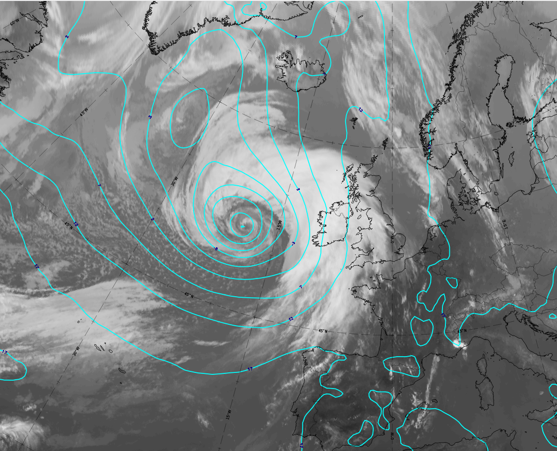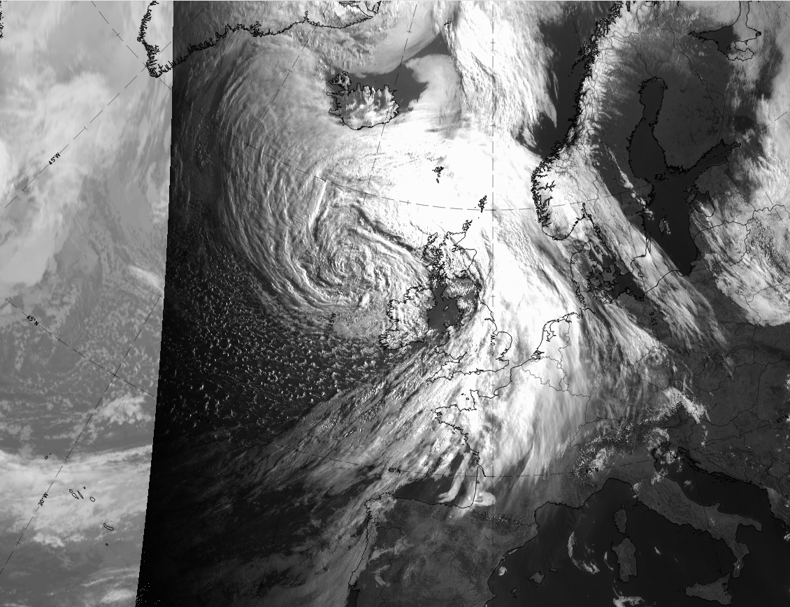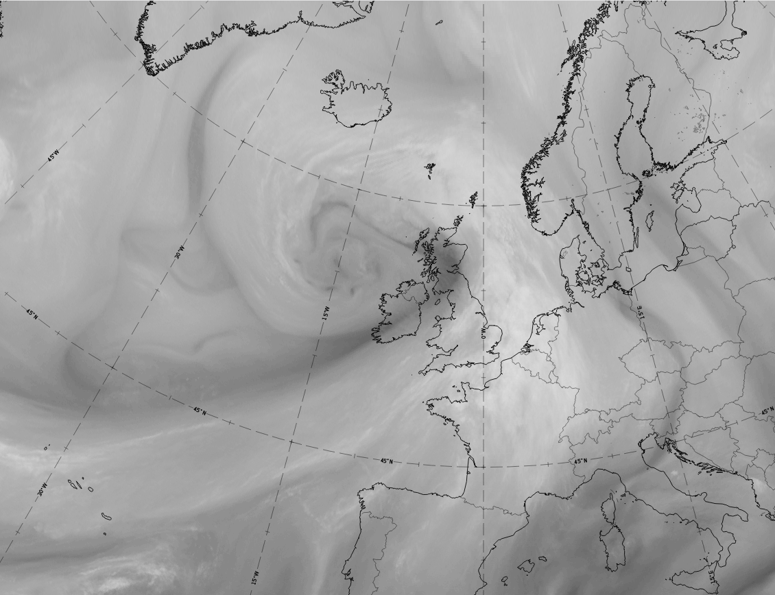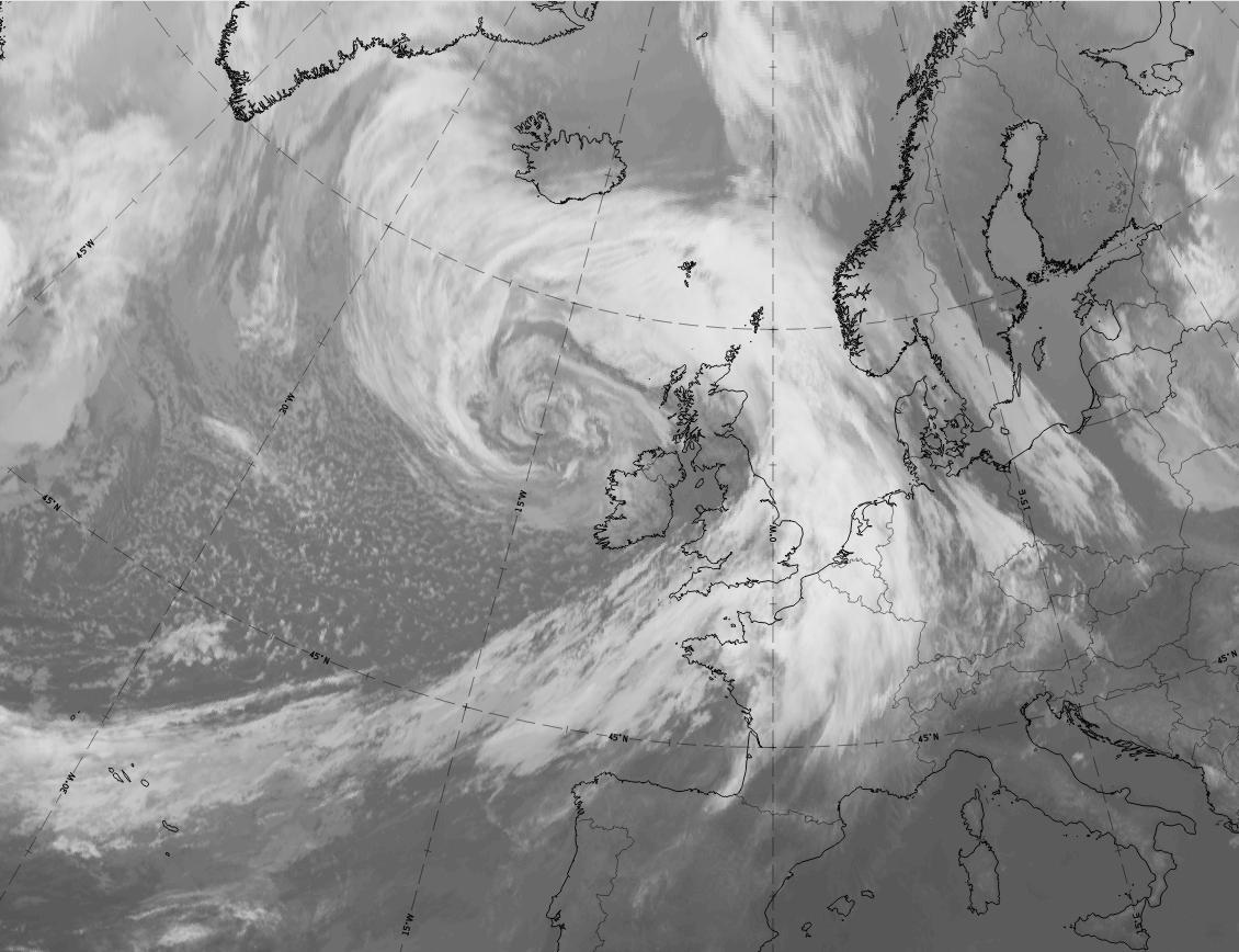 The development of the Convergence Clouds is shown by an increase in the cloud fraction with a north-westward movement from the south of Ireland to southern tip of Greenland. In the first two images Convergence Clouds are clearly darker than the clouds of the occlusion spiral, indicating that warmer cloud tops exist there.