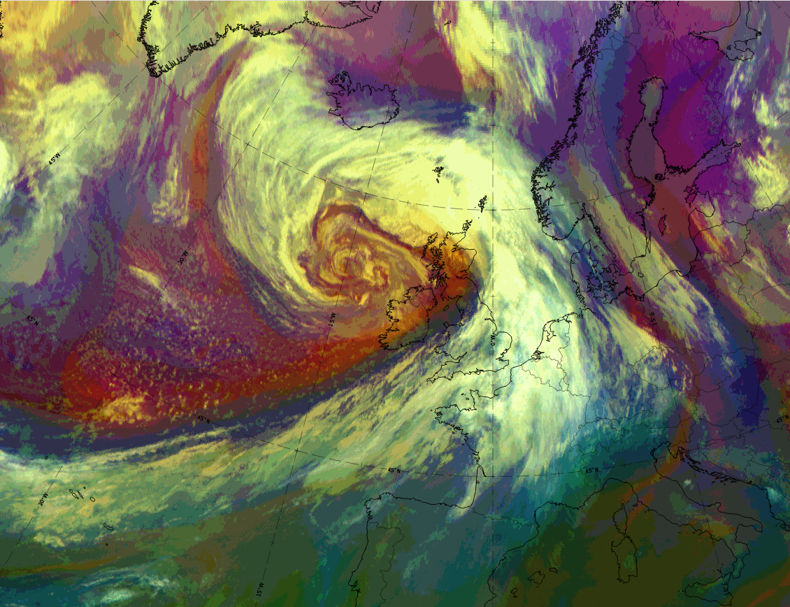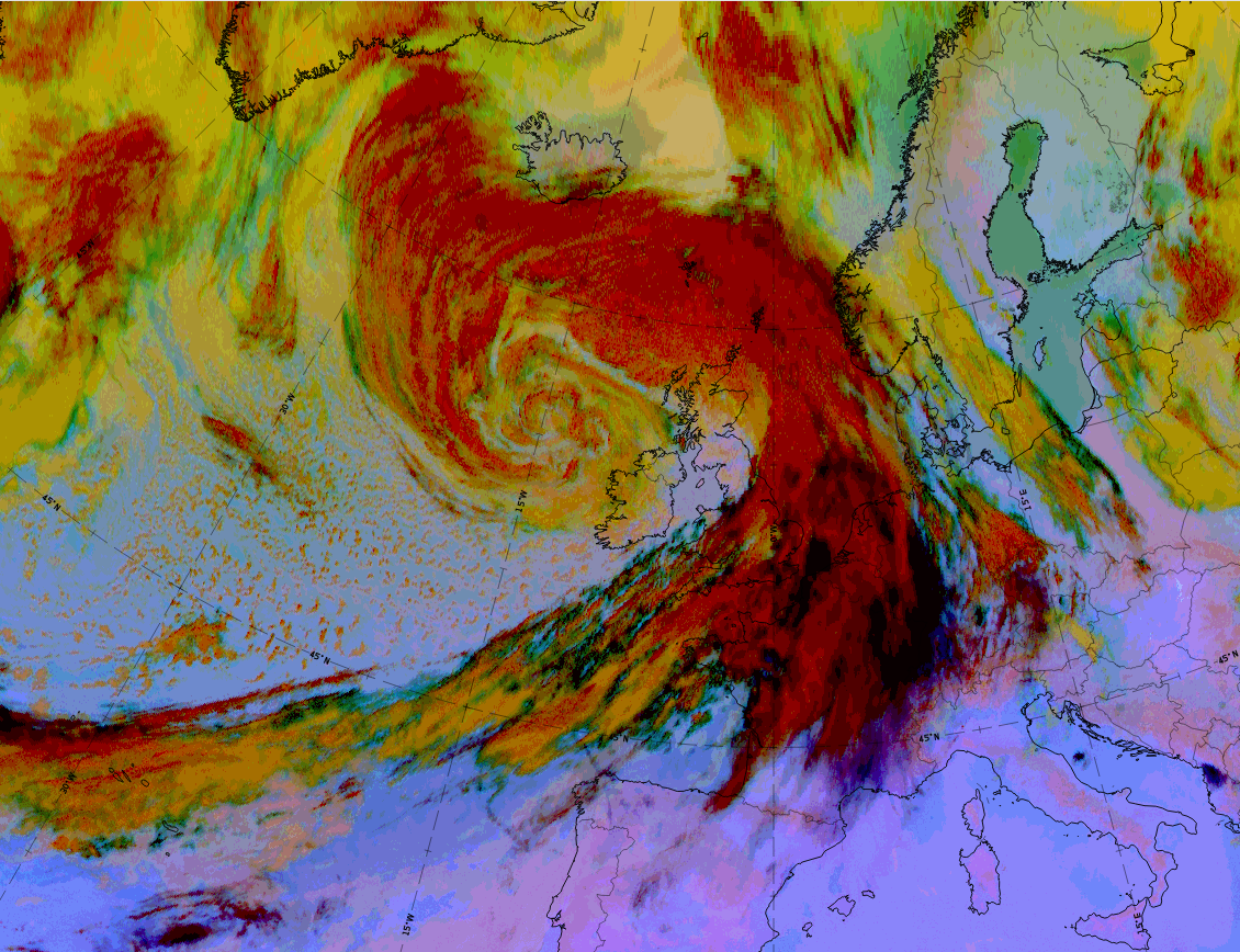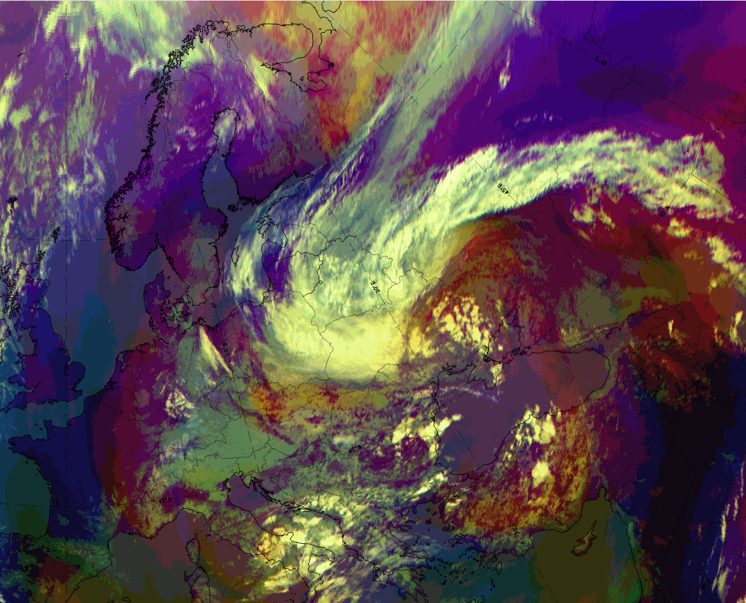 | Dust RGB | Dark red colours indicate thick ice clouds which do not differentiate much from the occlusion cloud spiral. In the southern latitudes, blue colours indicate the cloud free surface while in the more northern latitudes, ochre colours represent thin mid-level clouds surrounding the convergence and occlusion cloud bands. |
