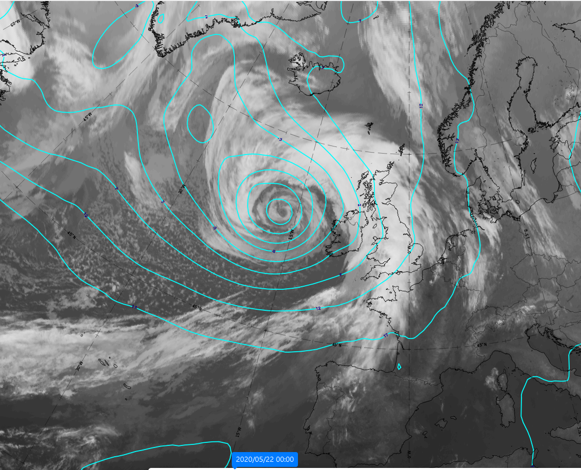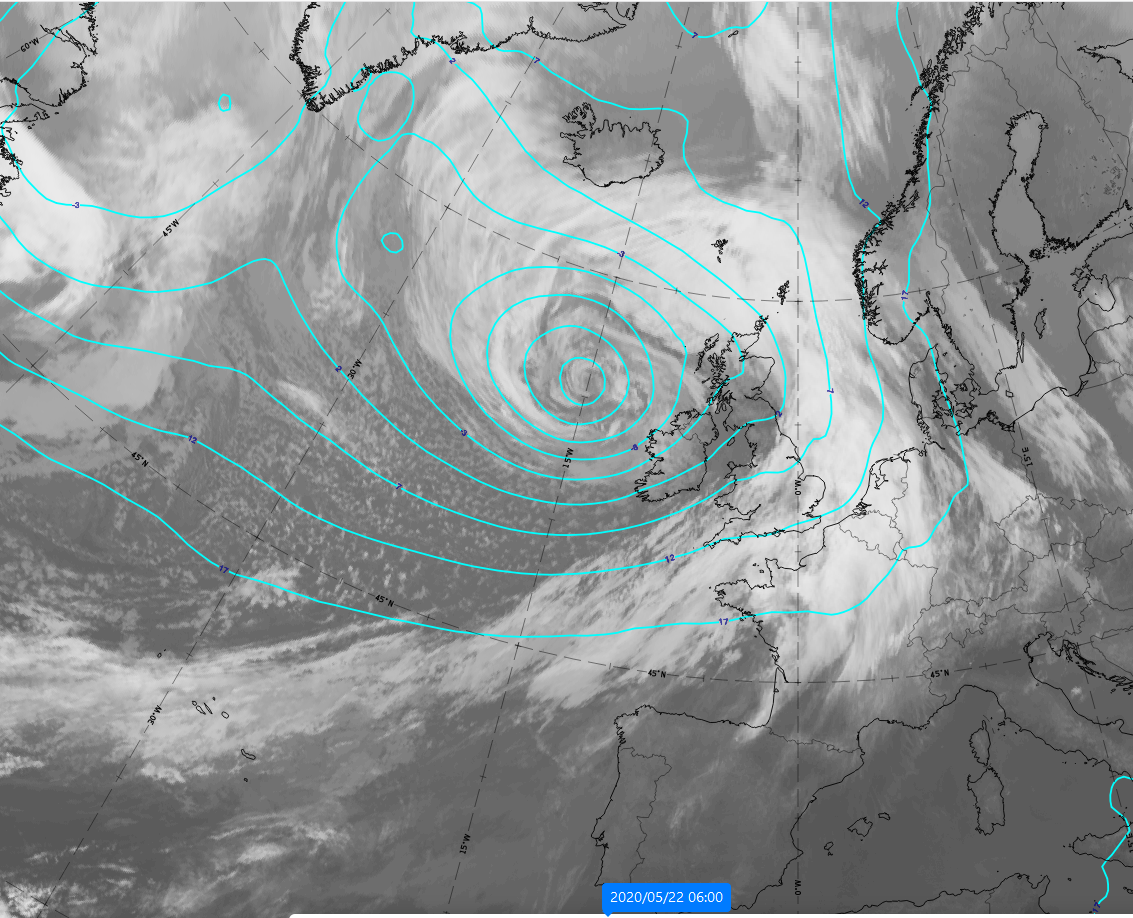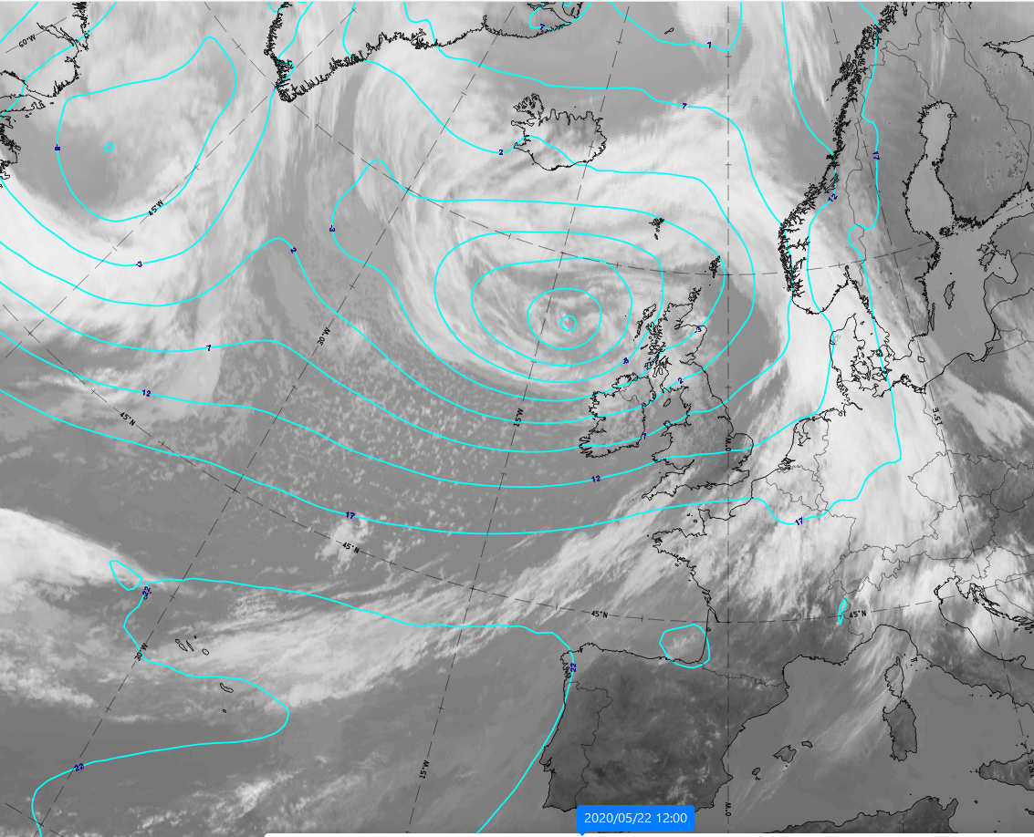 The case of 22 May 2020 shows at 06 UTC Convergence Clouds of type 1 (see the figure above). There is a highly developed low pressure centre to the west of Ireland with a corresponding occlusion spiral which extends from the Norwegian Sea between Iceland and Scotland, around the low. Parallel to this occlusion spiral extends the Convergence Clouds from the Atlantic between Greenland and Iceland southward, where it merges with the occlusion cloud band.