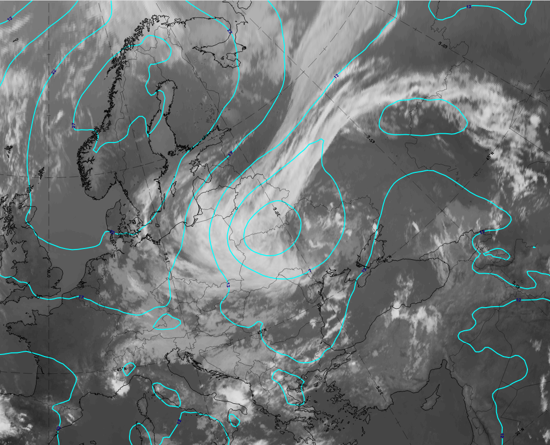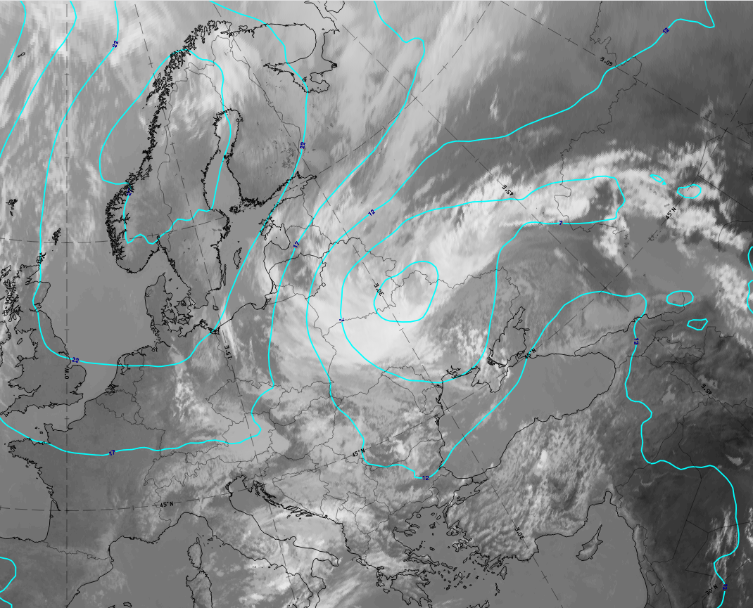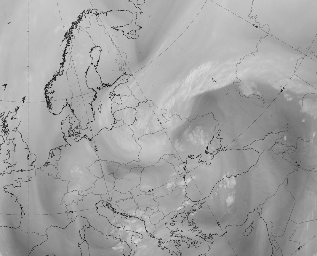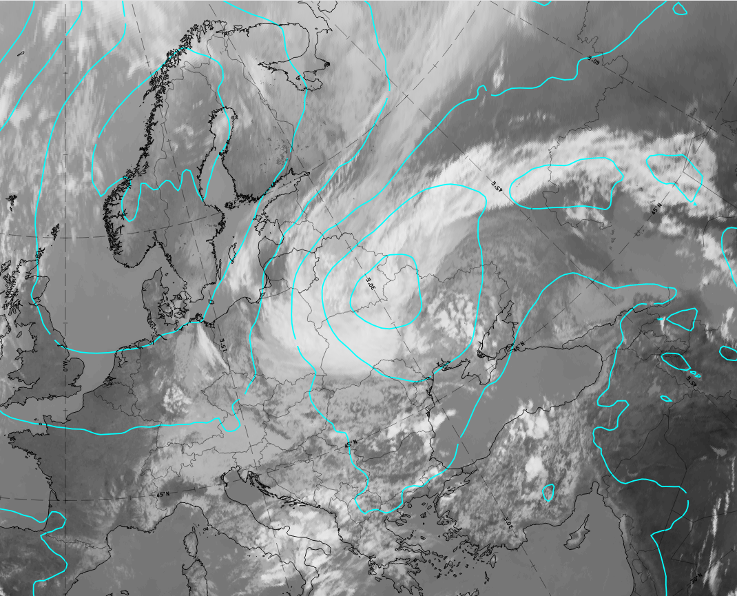 The case of 30 May 2020 at 12 UTC is an example of Convergence Clouds of type 2. On the one hand there is an occlusion spiral extending around a far developed low over North Ukraine and Belarus. On the other hand, there is a cold front cloud band extending from north Russia southward to Lithuania and Belarus. The Convergence Clouds develop in the transition area of both systems in the western part of the low pressure area.