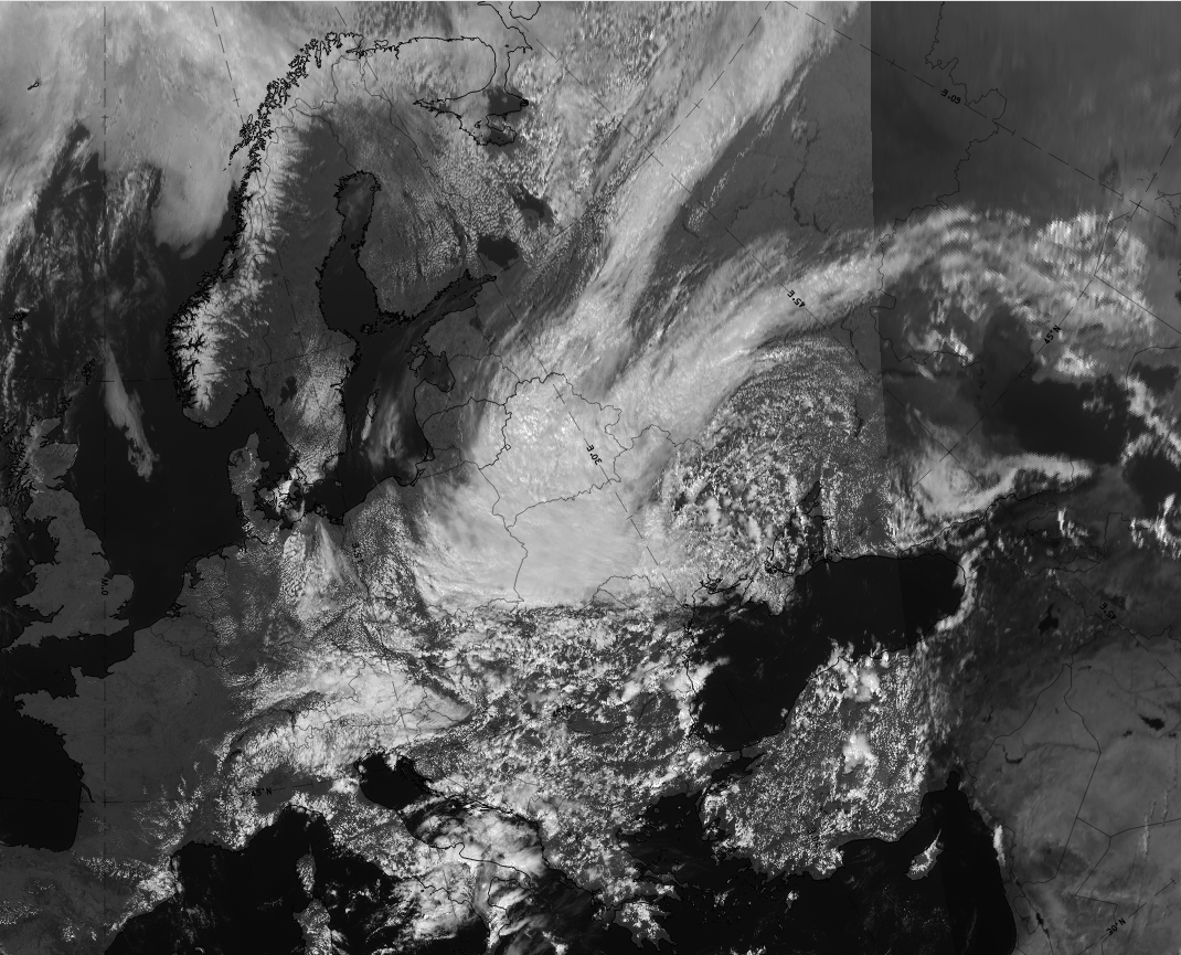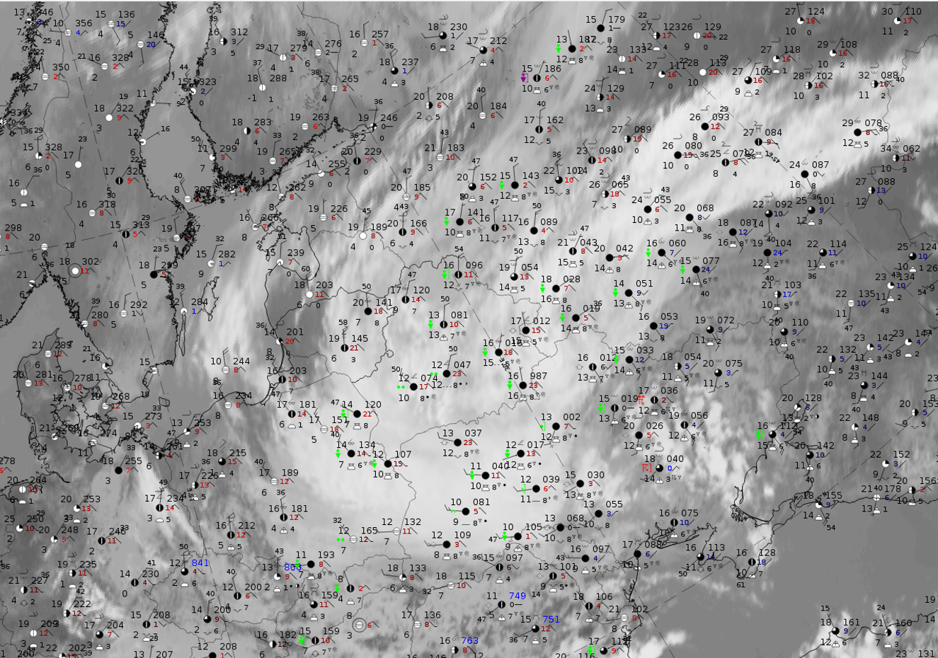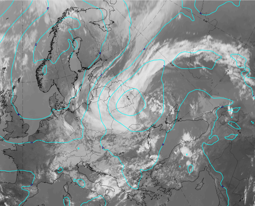 The case of 30 May 2020 at 12 UTC is an example of Convergence Clouds of type 2. On the one hand there is an occlusion spiral extending around a far developed low over North Ukraine and Belarus. On the other hand, there is a cold front cloud band extending from north Russia southward to Lithuania and Belarus. The Convergence Clouds develop in the transition area of both systems in the western part of the low pressure area.