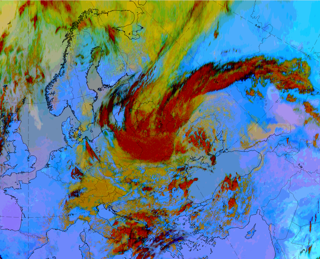 | Dust RGB | Dark-red colours indicate thick ice cloud. |