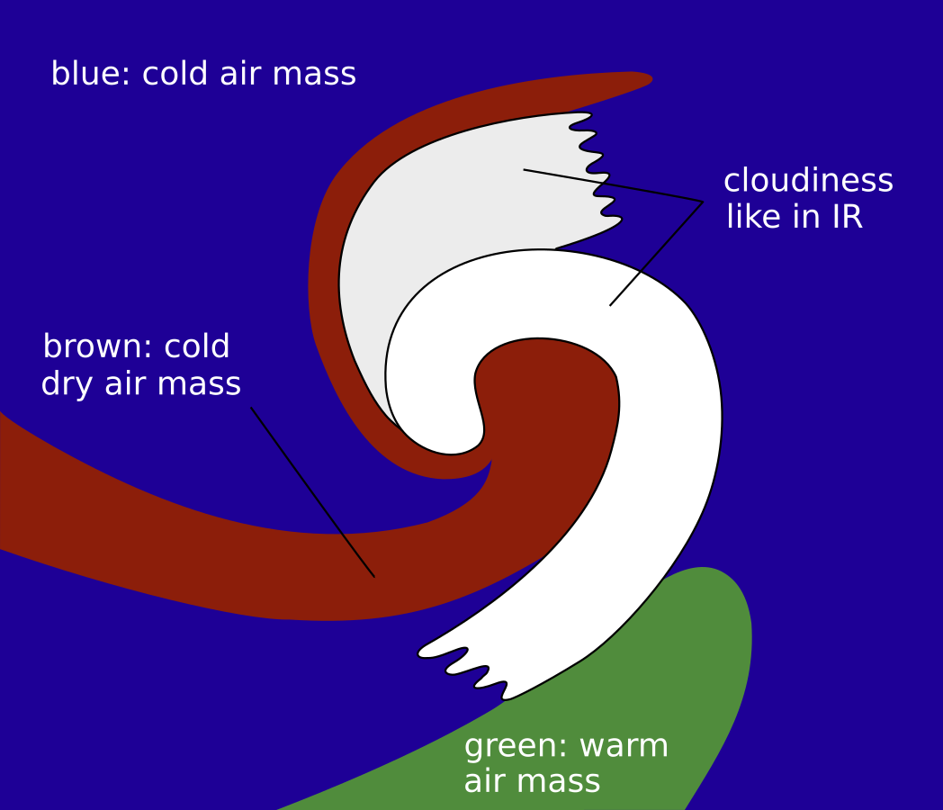 The Convergence Cloud develops within the cold airmass and is therefore surrounded by blue colours, however in most cases there is a dark brown stripe at its northern boundary which merges with the relevant dark brown area stretching into the centre of the occlusion.