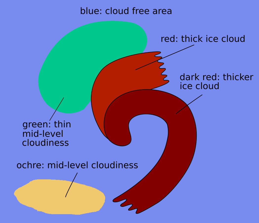 The surroundings of the Convergence Cloud are light blue where there is a cloud free surface. As the development of the Convergence Cloud very often takes place in northern regions, large parts around the feature can be green, representing transparent mid-level cloudiness.