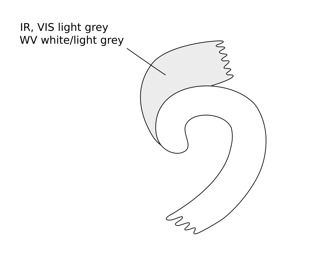 - IR10.8: often a little bit warmer cloud-top temperatures than those associated with the occlusion cloud, therefore they appear light grey in the IR image, and are sometimes fibrous and broken