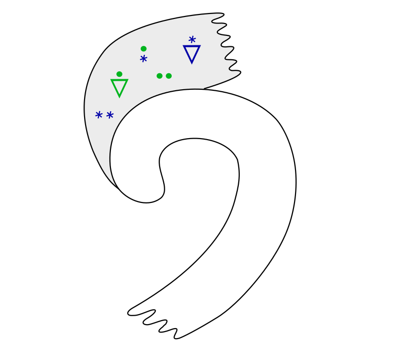 According to the schematic below, Convergence Cloud can be seen during the far developed occlusion stage as a separate, curved cloud band which spirals approximately parallel to the occlusion spiral, from the Northeast to the end of the occlusion spiral. With a short inspection it could be classified as the remnants of a warm front cloud band but when taking into account the development process it becomes clearly different. It develops not together with the occlusion but develops later instead. This is discussed in the chapter: "Meteorological-physical background".