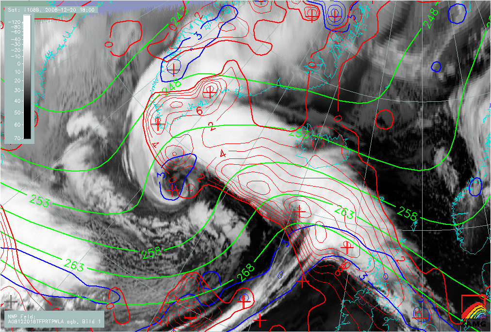 20 December 2008/18.00 UTC - Meteosat 9 IR10.8 image; red: temperature advection 700 hPa, blue: TFP, green: equivalent thickness