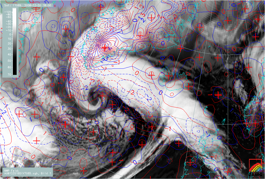 20 December 2008/18.00 UTC - Meteosat 9 IR10.8 image; red: divergence 850 hPa, blue: divergence 700 hPa