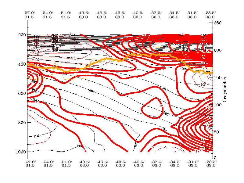 19 March 2004/12.00 UTC - Meteosat IR image; magenta: relative streams 298K, yellow: isobars 298K