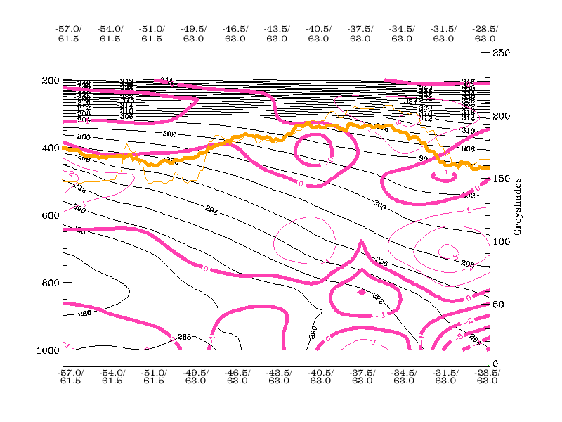 20 December 2008/18.00 UTC - Vertical cross section; black: isentropes (ThetaE), magenta thick: convergence, magenta thin: