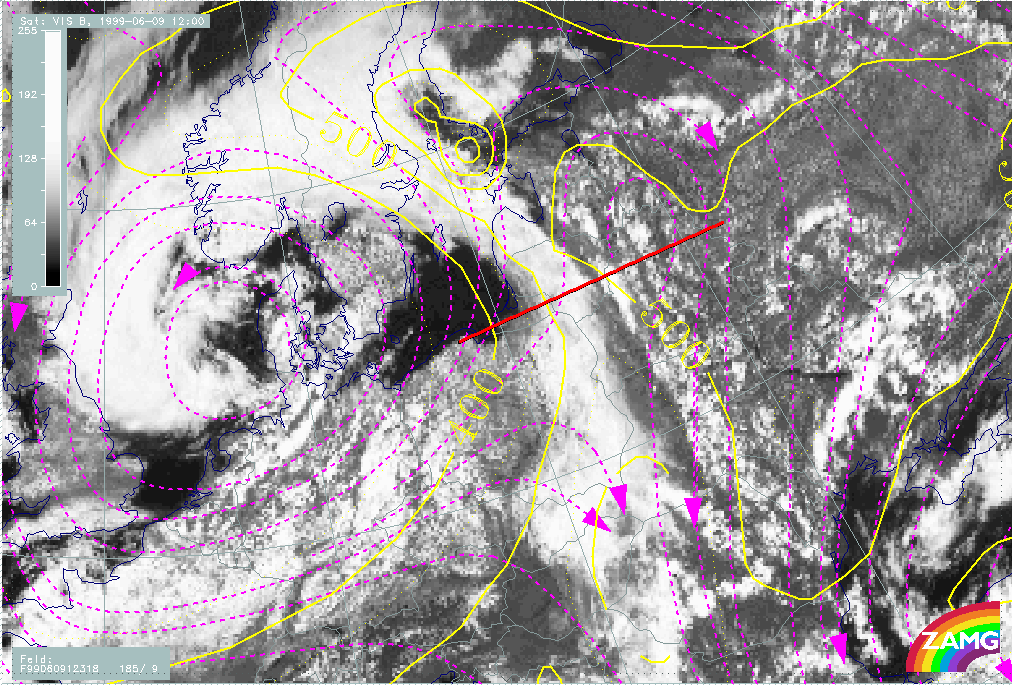 09 June 1999/12.00 UTC - Meteosat VIS image; magenta: relative streams 318K, yellow: isobars 318K; position of vertical cross section indicated