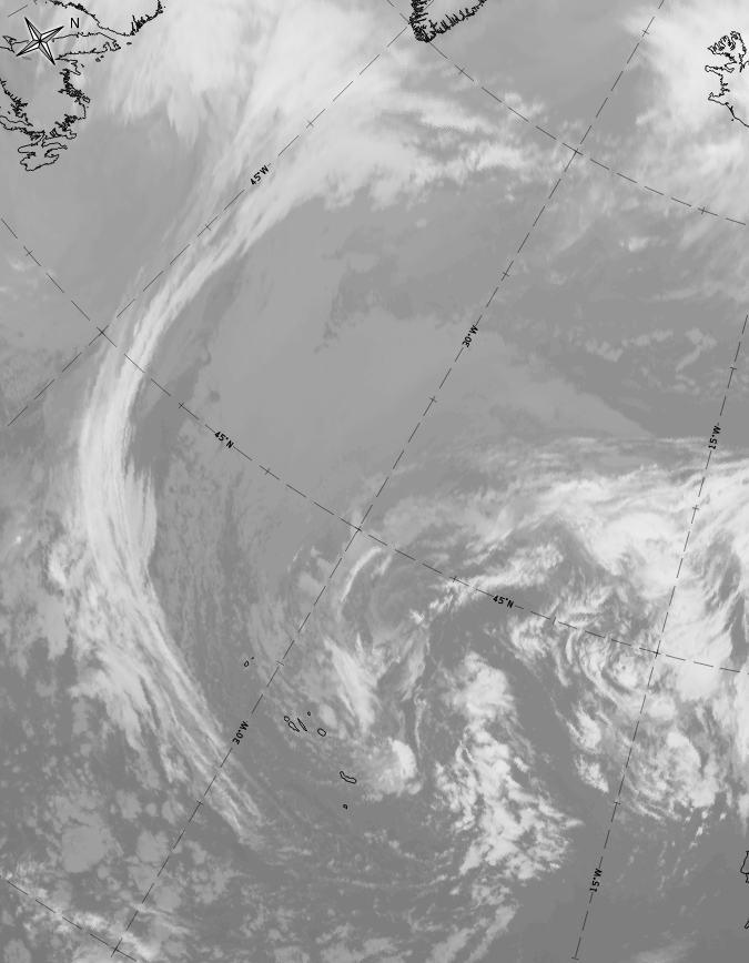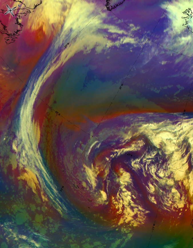 In the most advanced stage of development, the deformation cloud band consists of dark red stripes and fibres indicating rather thick ice cloud. During the decay process, the stripes and fibres become thinner and therefore change to black colours. Low level cloud patches also appear below.