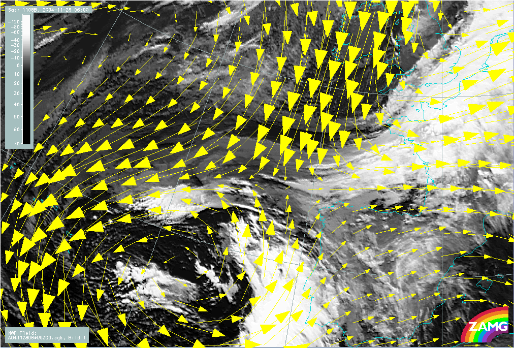 28 November 2004/06.00 UTC - Meteosat 8 IR 10.8 image; yellow: streamlines 300 hPa