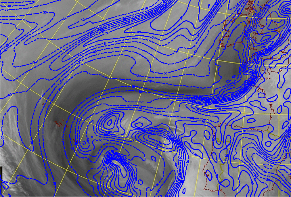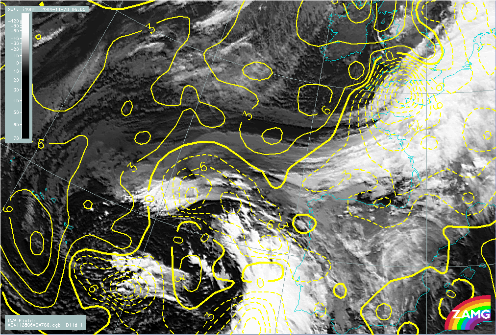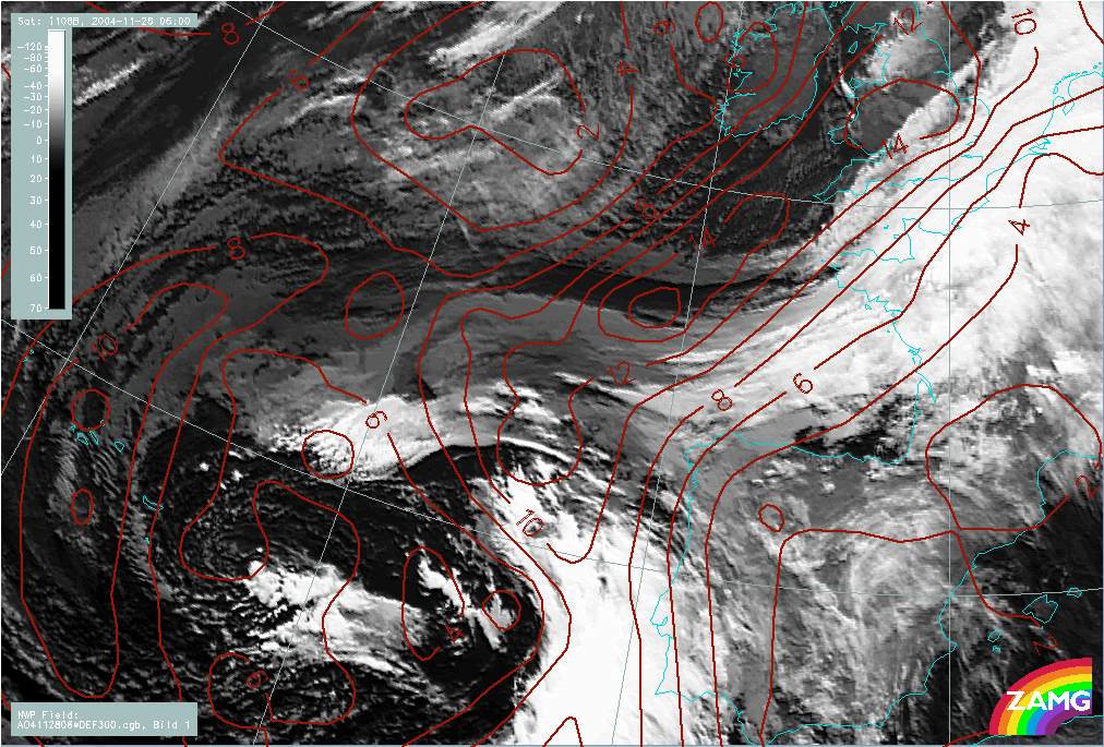 28 November 2004/06.00 UTC - Meteosat IR image; brown: total deformation 300 hPa