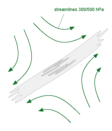Wind vectors, preferably streamlines, show the presence of a col (saddle surface) at the area of deformation, with confluence on both sides of the col - Total deformation at 300 and 500 hPa