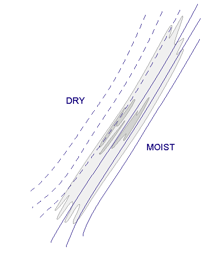 Total deformation maximum found in the vicinity of the col, with maximum values in the confluent zone on the cold side, where the jet is tightest - Upper/middle tropospheric humidity