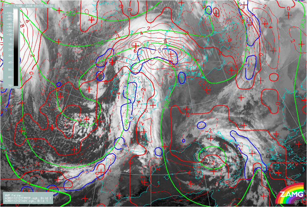 13 January 2008/12.00 UTC - Meteosat 9 IR10.8 image; green: equivalent thickness 500/850 hPa, blue: thermal front parameter 500/850