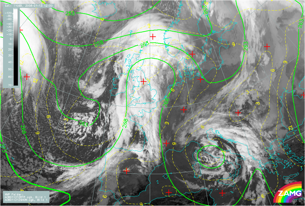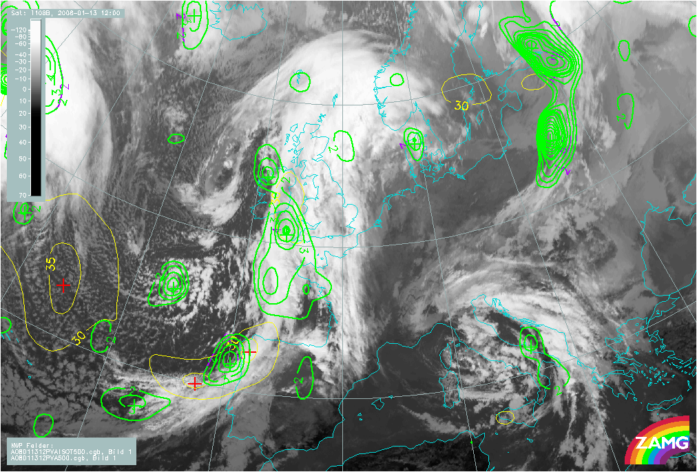 13 January 2008/12.00 UTC Meteosat 9 IR10.8 image; yellow: isotachs 500 hPa, green: voriticity advection 500 hPa