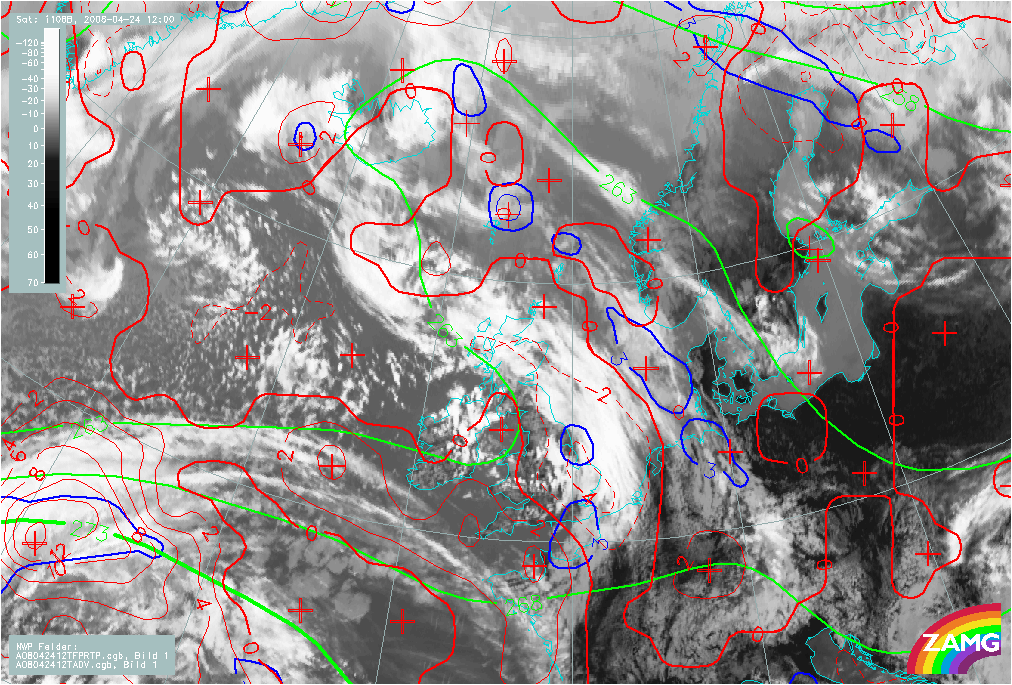 24 April 2008/12.00 UTC - Meteosat 9 IR10.8 image; green: equivalent thickness 500/850 hPa, blue: thermal front parameter 500/850