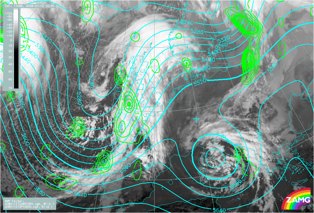 13 January 2008/12.00 UTC - Meteosat 9 IR10.8 image; cyan: height contours 500 hPa, green: vorticity advection 500 hPa