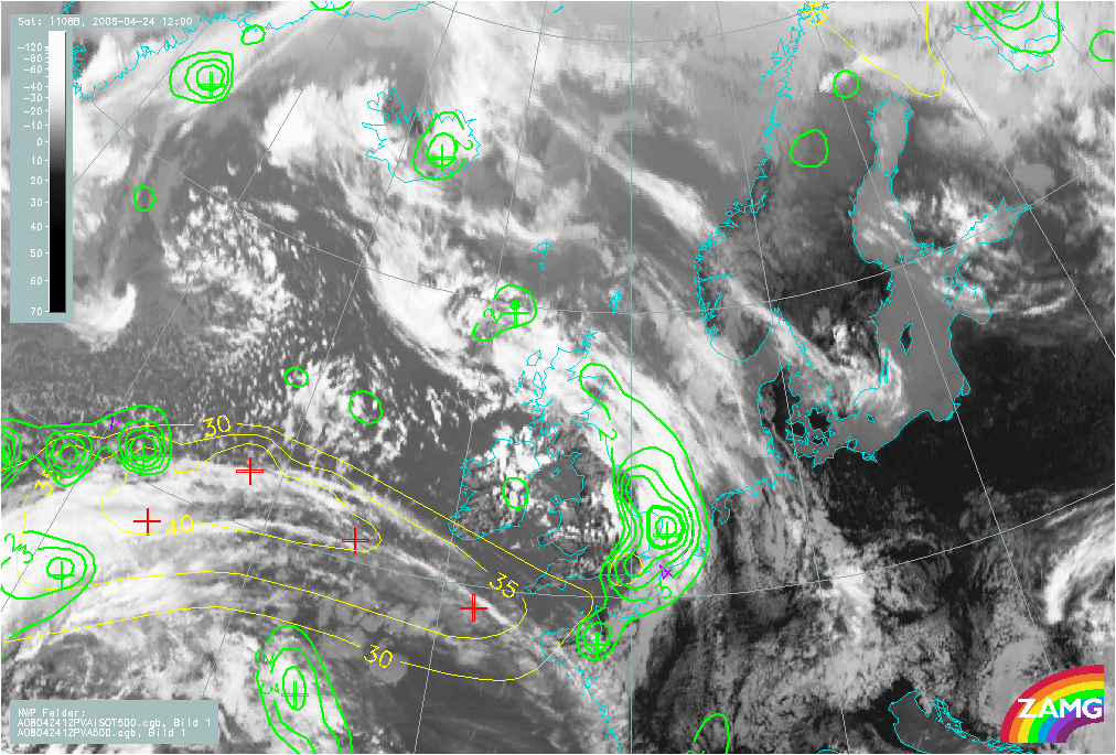 24 April 2008/12.00 UTC Meteosat 9 IR10.8 image; yellow: isotachs 500 hPa, green: vorticity advection 500 hPa
