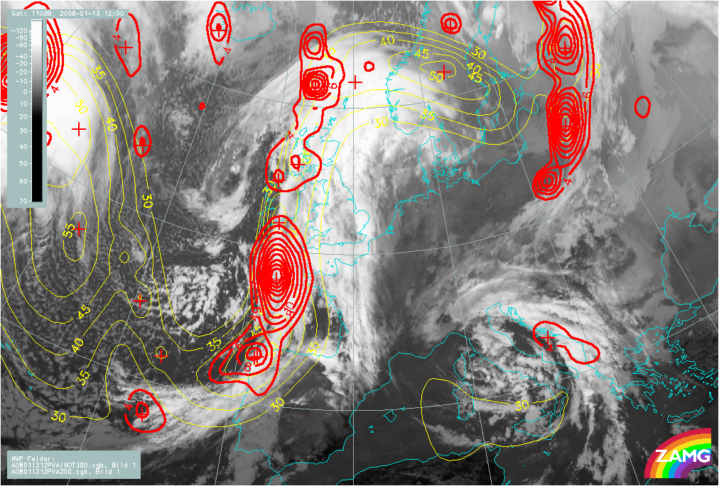 13 January 2008/12.00 UTC - Meteosat 9 IR10.8 image; yellow: isotachs 300 hPa, red: voriticity advection 300 hPa