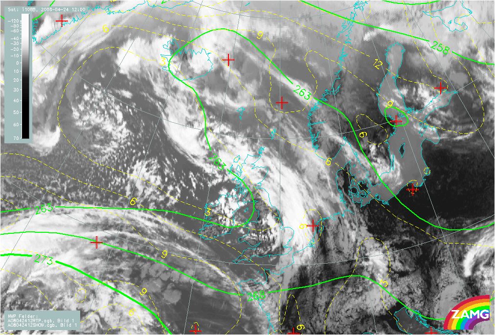 24 April 2008/12.00 UTC - Meteosat 9 IR10.8 image; green: equivalent thickness 500/850 hPa, yellow: Showalter index