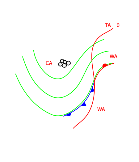 In the area of EC the equivalent thickness is marked by a trough or a minimum, indicating cold air. This is an area of relatively low ThetaW values at 850 hPa. Usually this is also an area of synoptic scale CA; but there is no distinct relation between an EC and a CA maximum; ECs can also be in areas of smaller scale WA (for instance in connection with a following Warm Front system) - Height contours at 500 hPa: