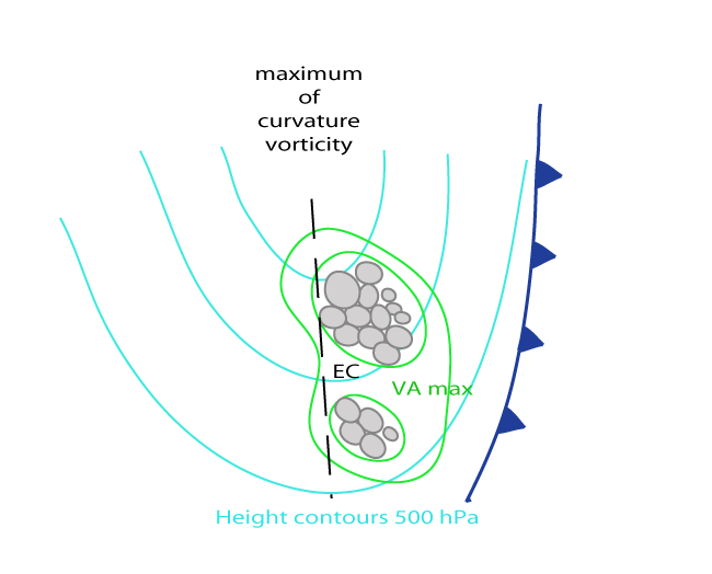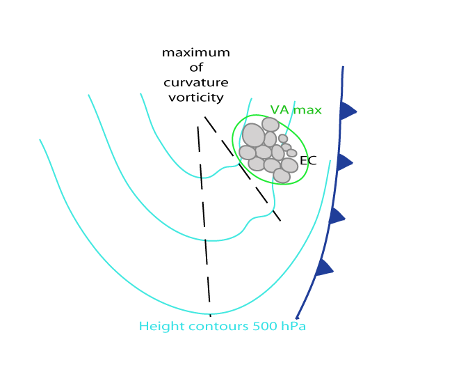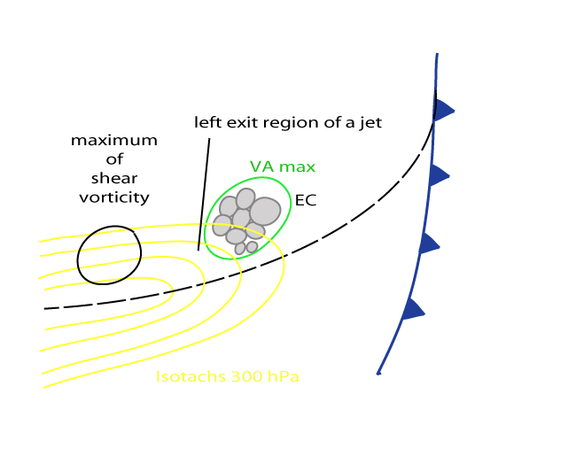 ECs and Cb Clusters often develop at the left exit region of a strong jet streak. This is often close to the rear of the upper level trough - Positive Vorticity Advection (PVA) at 500 and 300 hPa: