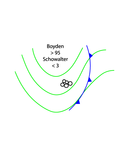 EC and Cb cluster appear in areas of instability characterised by the Boyden Index (>95) or the Showalter index (<3); but the values are typically less unstable than in the warm air ahead of fronts.